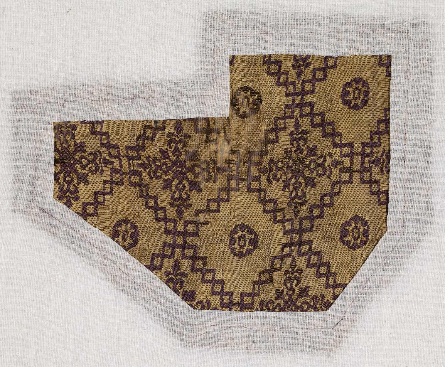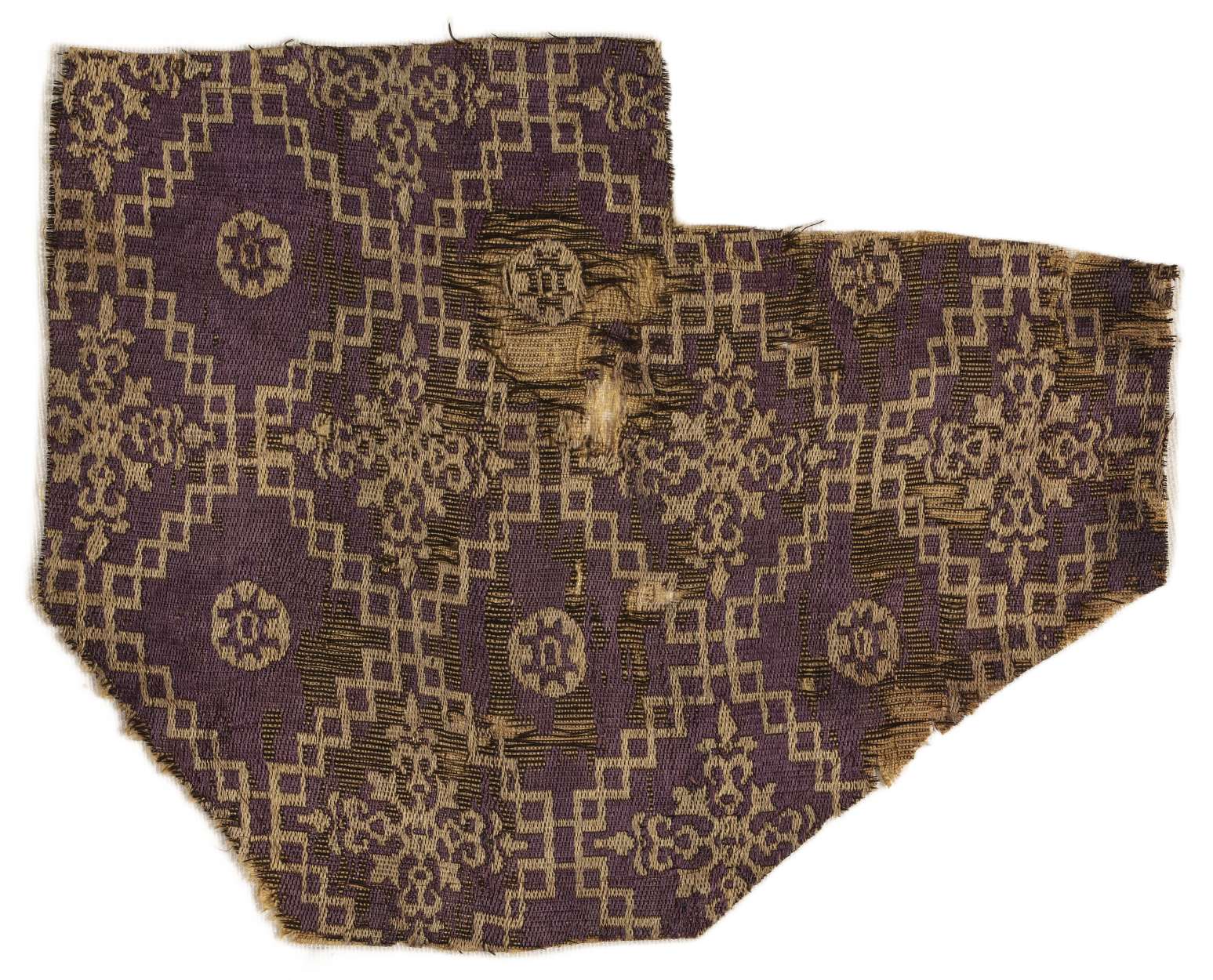 Reliekomhulsel, donkerpaars/geel met ruitachtig patroon, waarin cirkels met achtpuntige sterren afgewisseld met kruisbloemige ornamenten, omwindsel uit verzameling relieken H. Jeroen en H. Adelbert