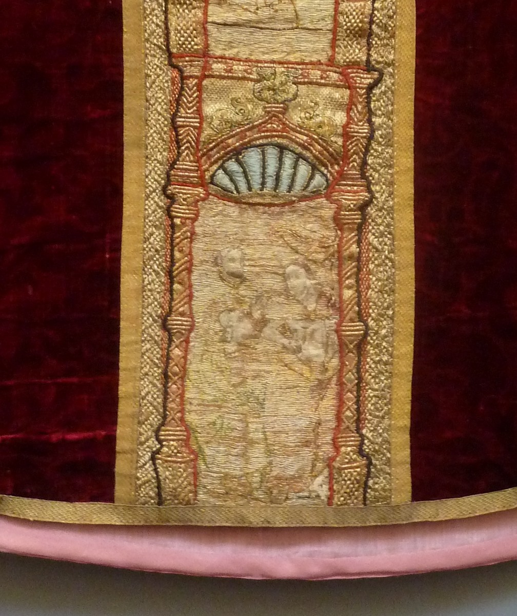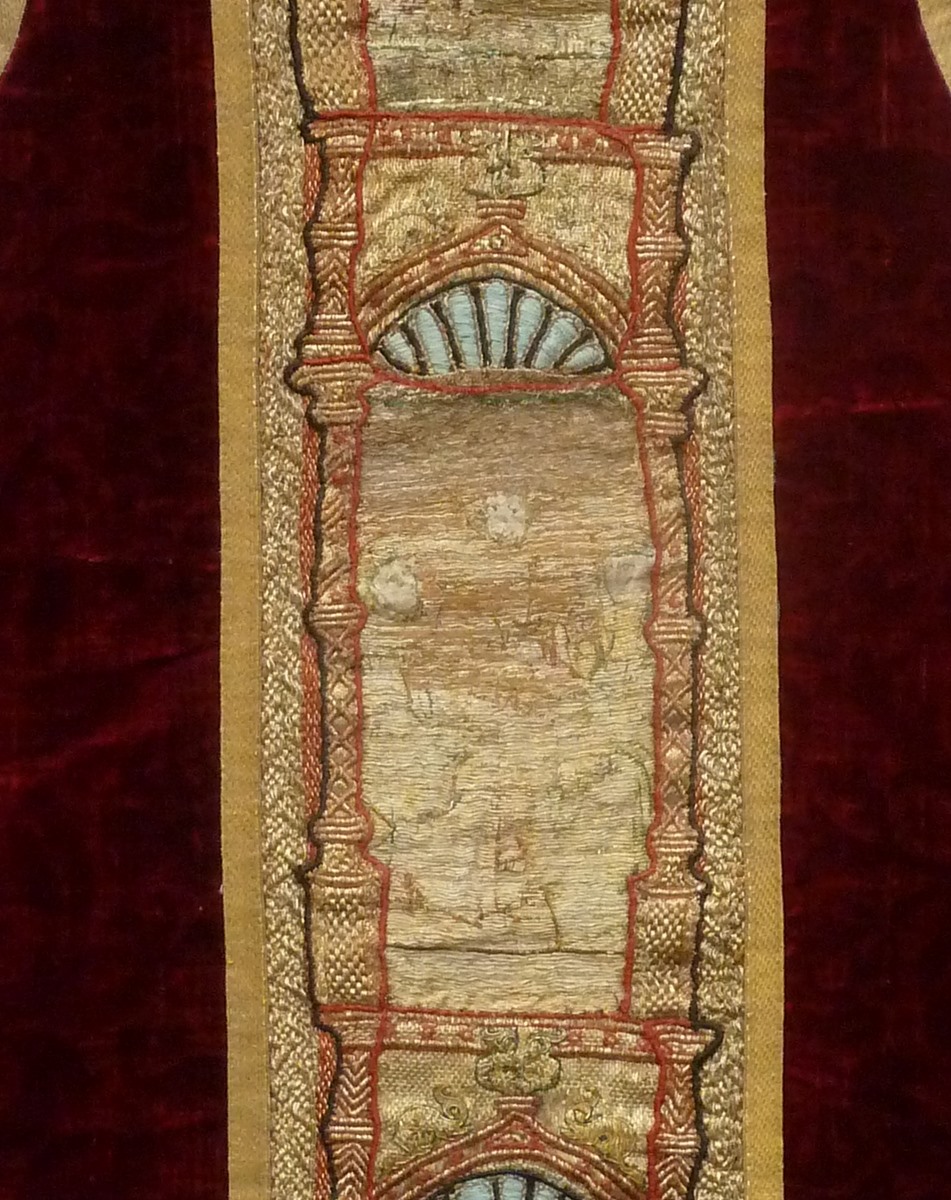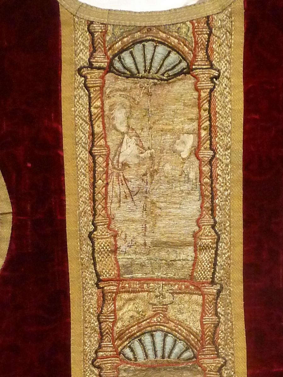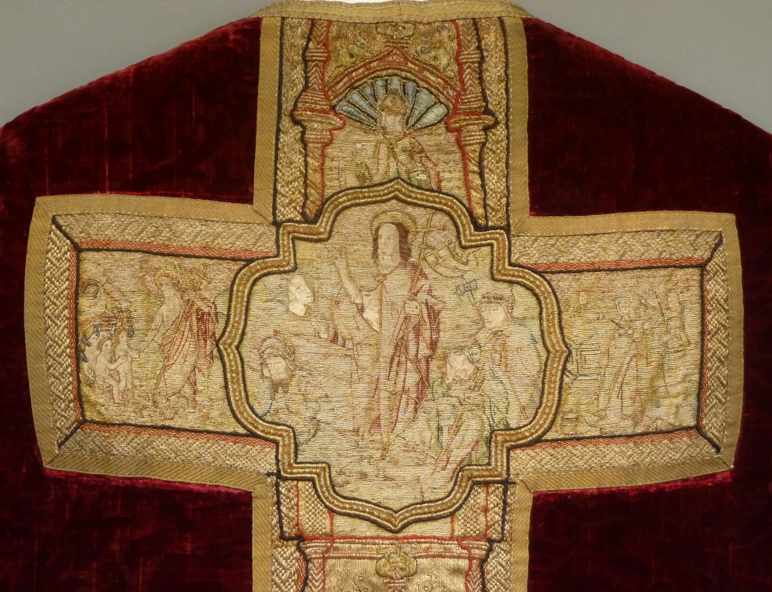 Rood fluwelen kazuifel met geborduurde scènes passie van Christus en verrijzenis