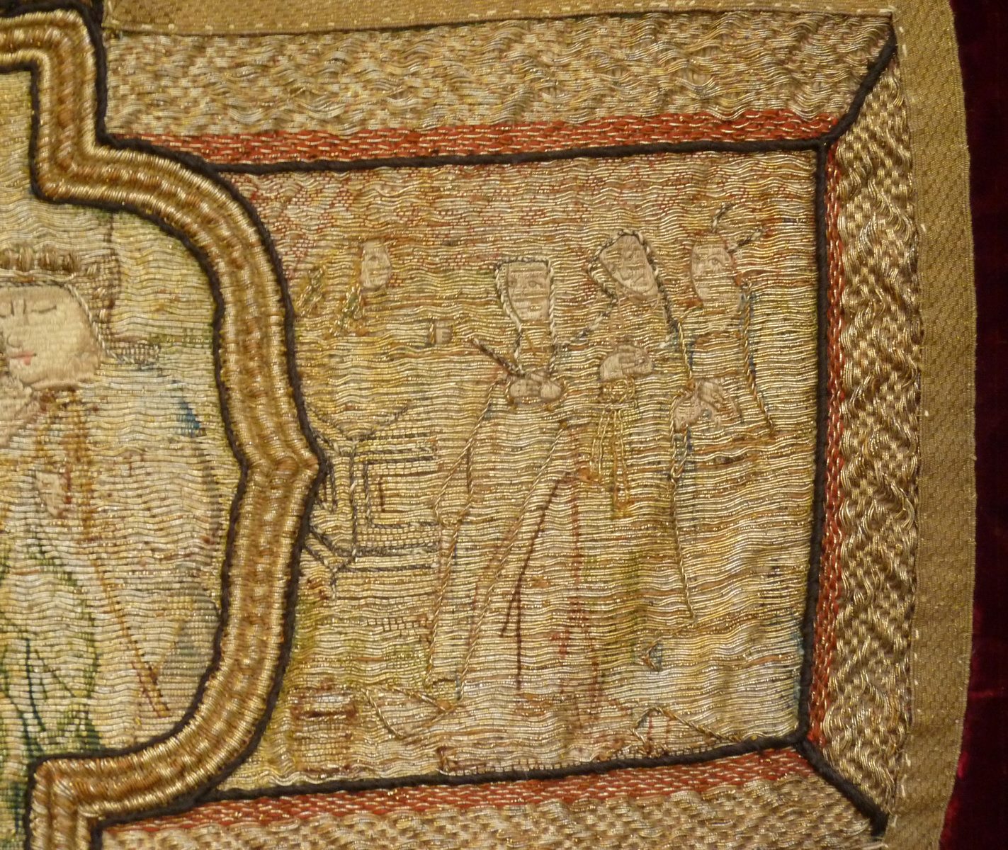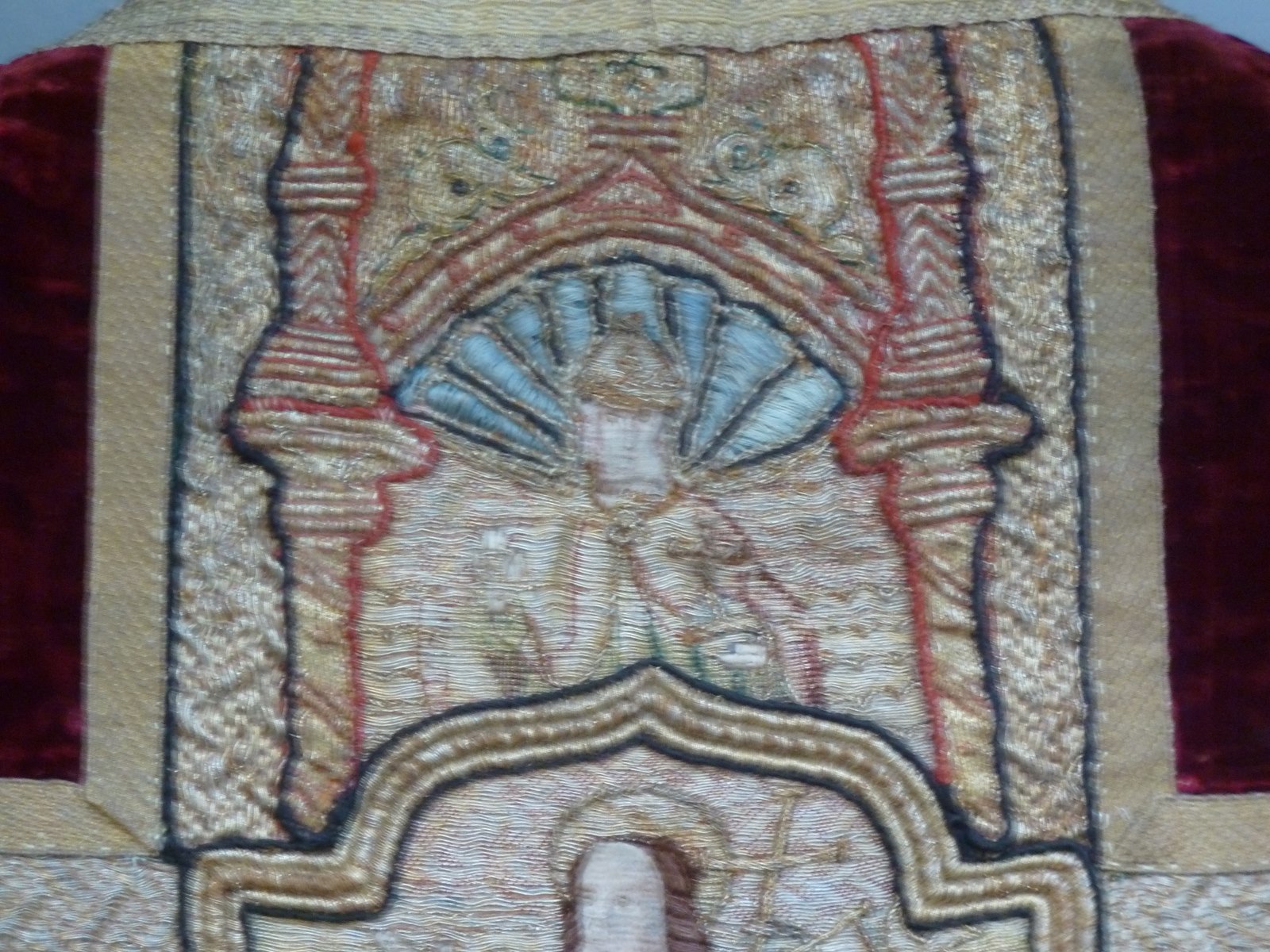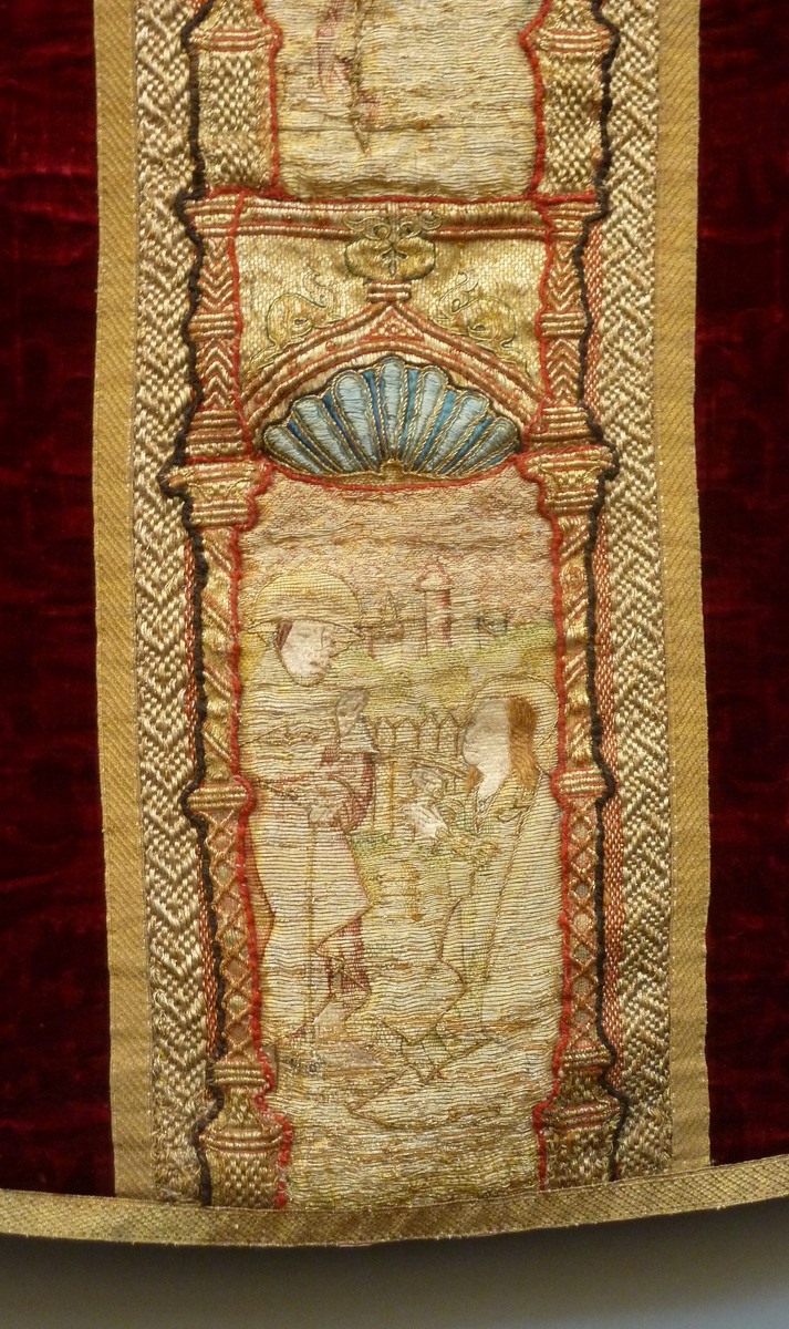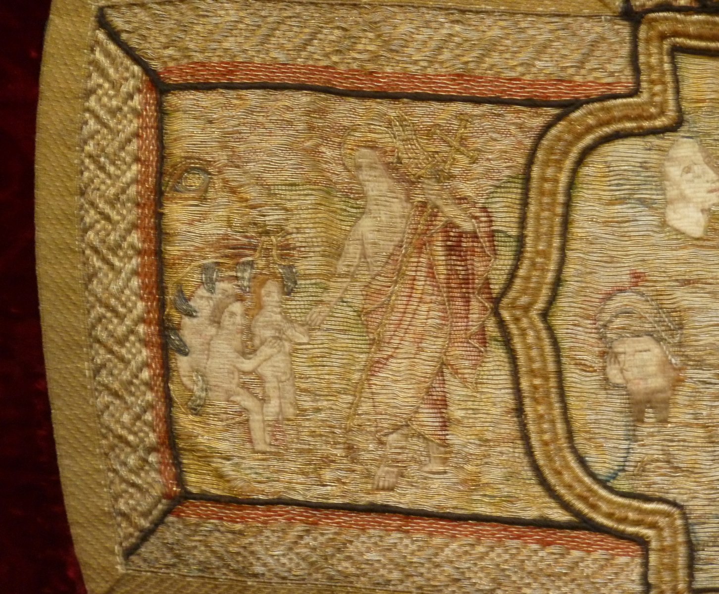 Rood fluwelen kazuifel met geborduurde scènes passie van Christus en verrijzenis