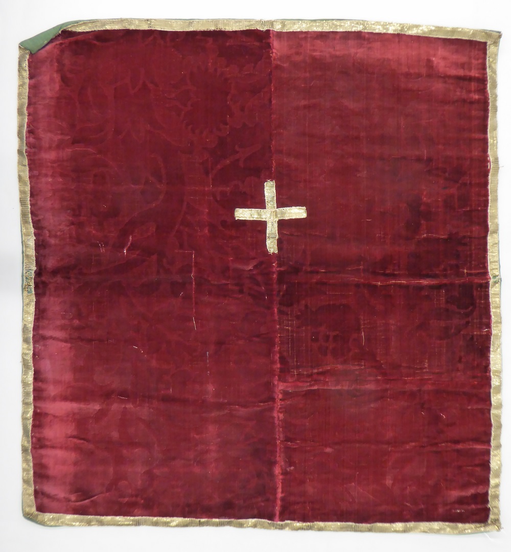 Rood fluwelen kelkvelum met uitgeschoren granaatappelmotief, kruisje en rand van goudgalon
