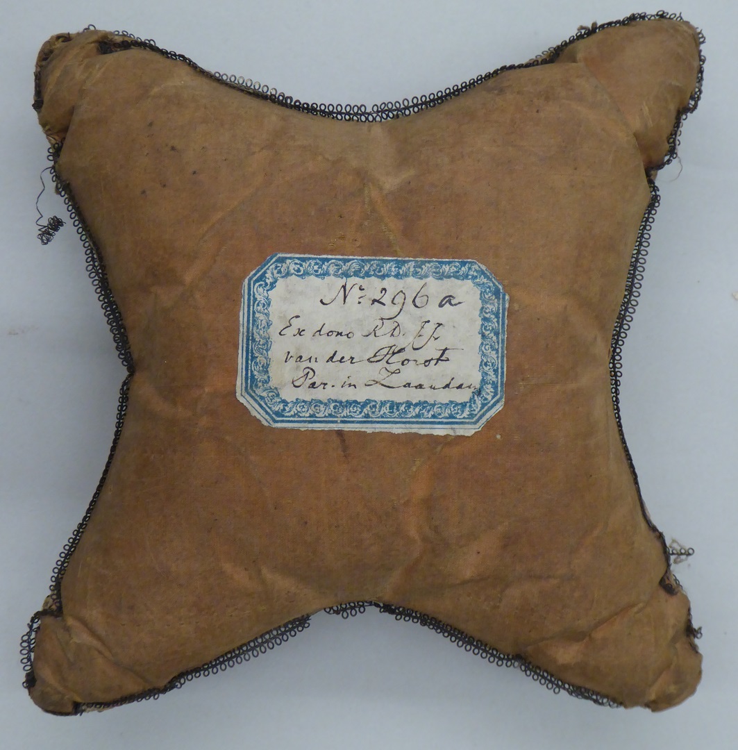 Wit (nu bruin) speldenkussen versierd met kralen en bouillonwerk, geborduurde lelie