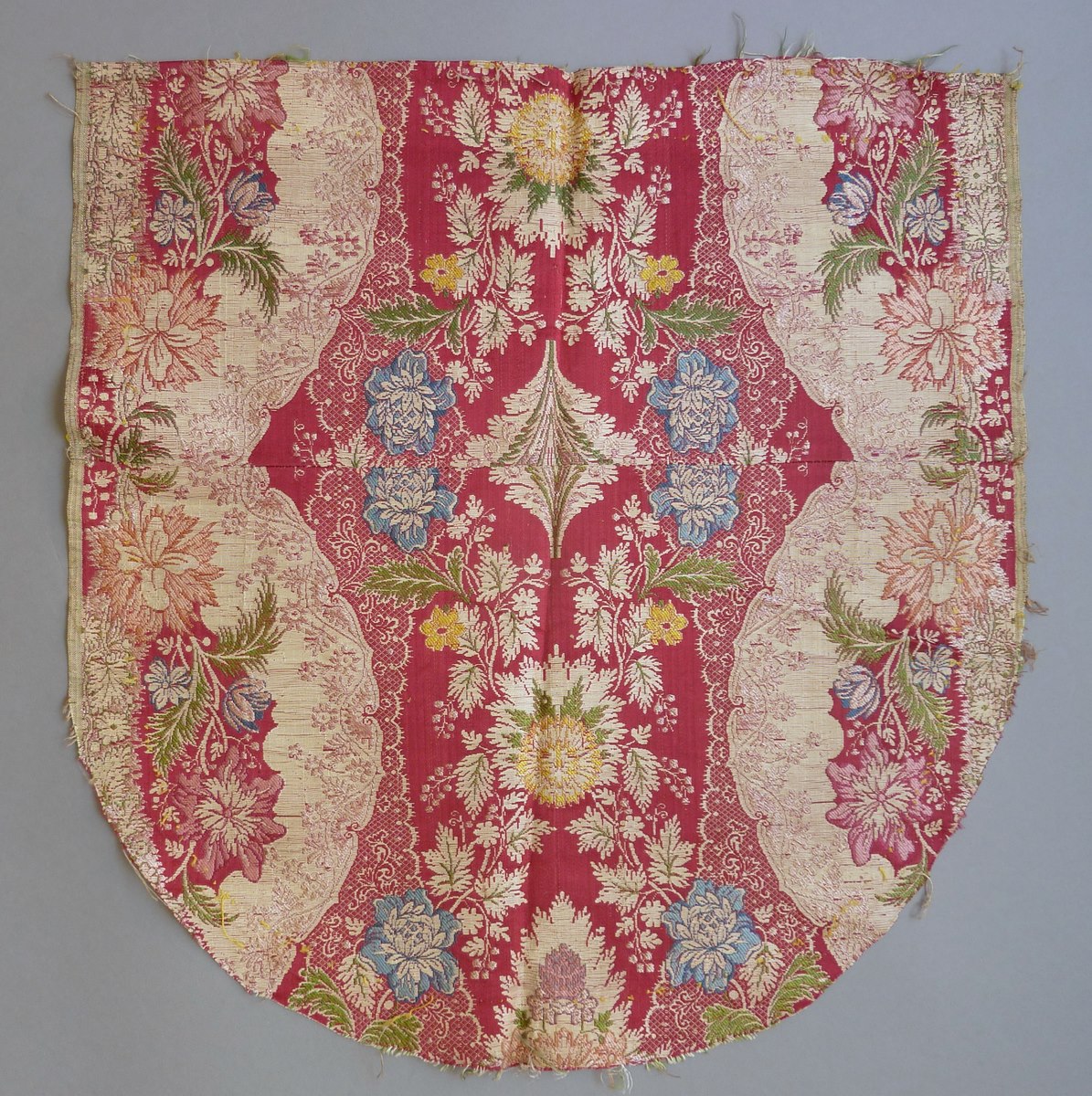 Purper textielfragment met bloempatroon in vorm van koorkapschild