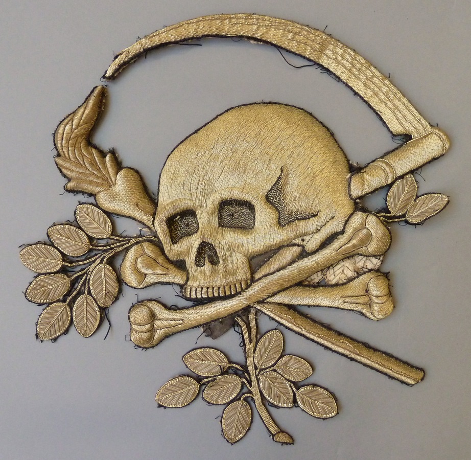 Doodskop in reliëf, zeis en fakkel, verstevigd met papier