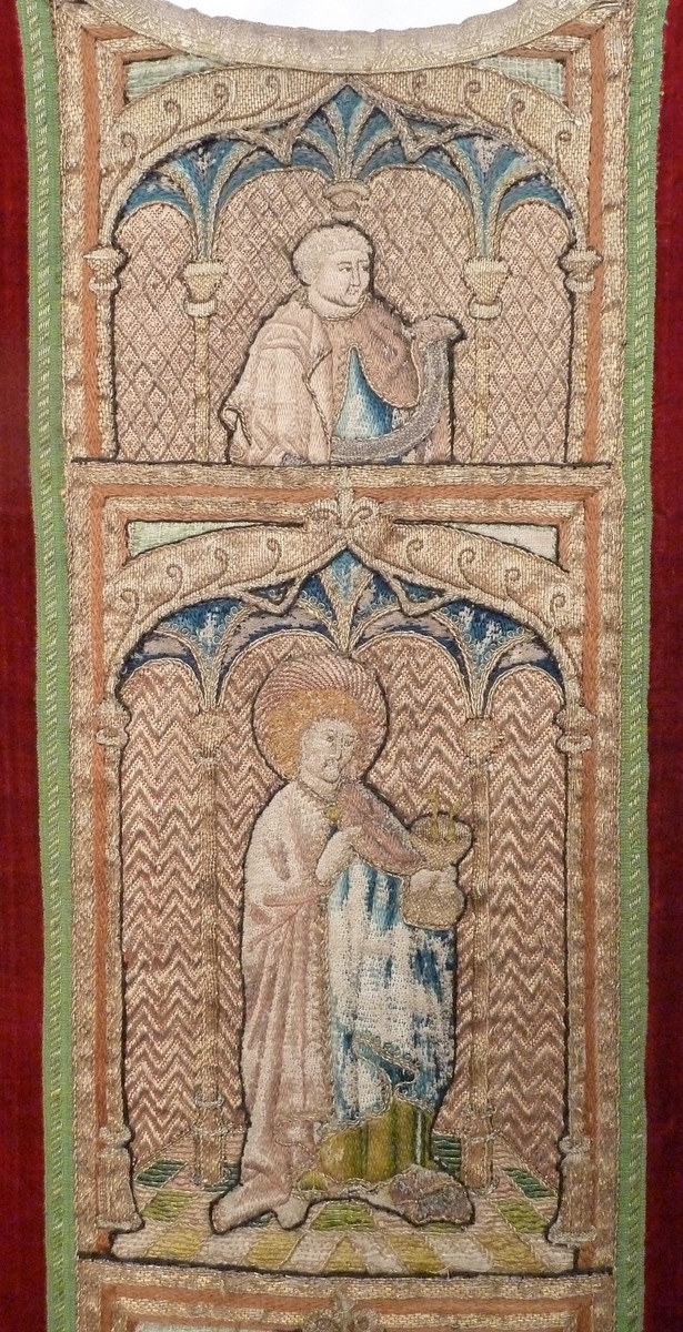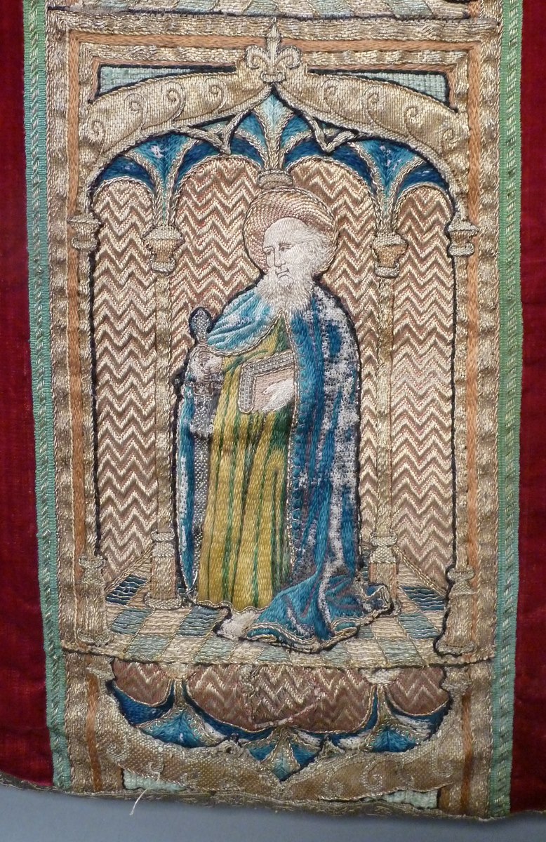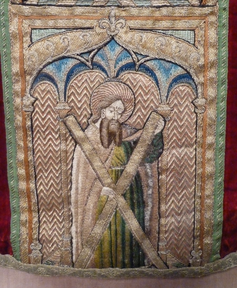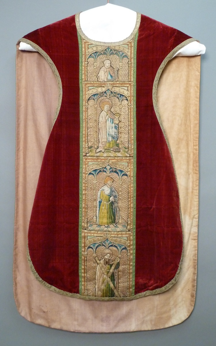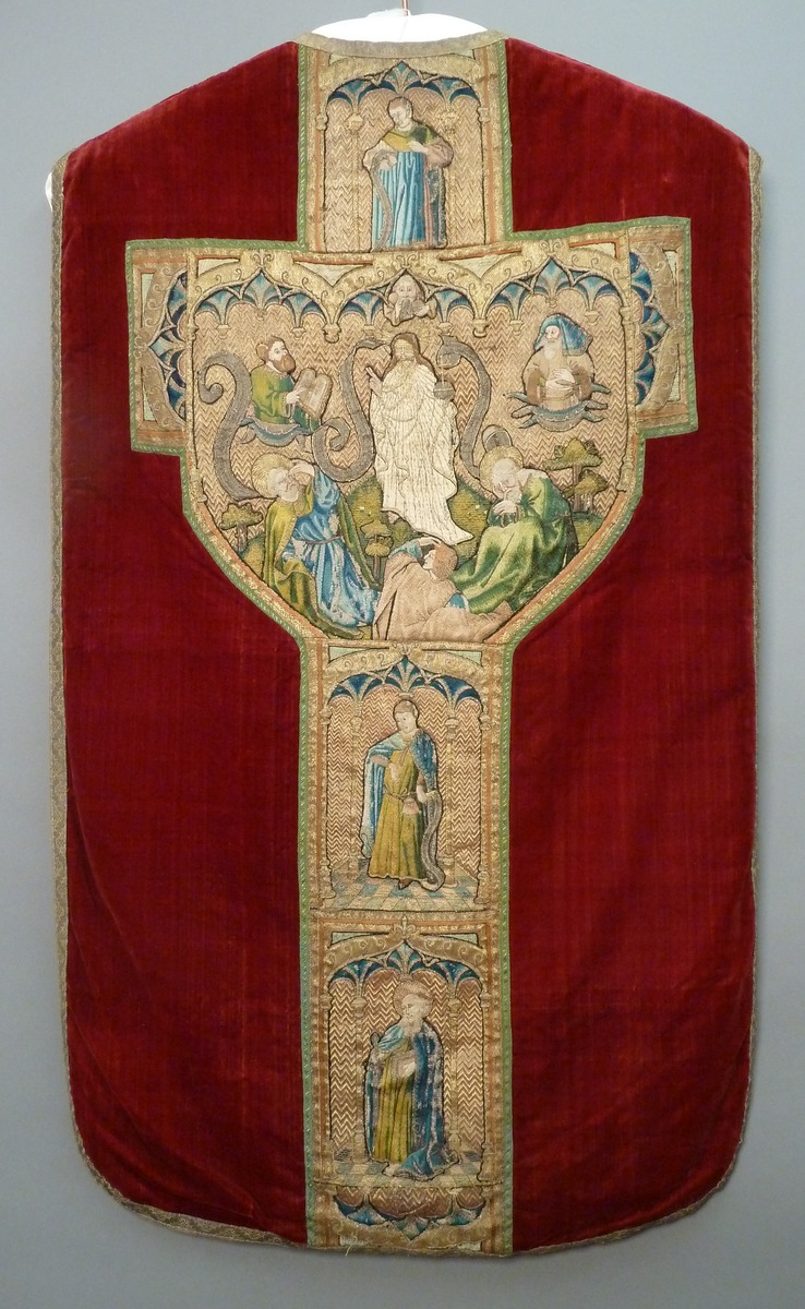 Kazuifel van rood zijdefluweel in vioolvorm met geborduurde versieringen, die oorspronkelijk van een koorkap afkomstig zijn. Centraal op de achterkant het koorkapschild, waarop onder gotische gewelven de verheerlijking van Christus op de berg Thabor wordt weergegeven (Matt. 17:1-13, Marc. 9:2-13, Luc. 9:28-36). Christus staat in het midden. Zijn gelaat is met gouddraad overspannen om zijn ...