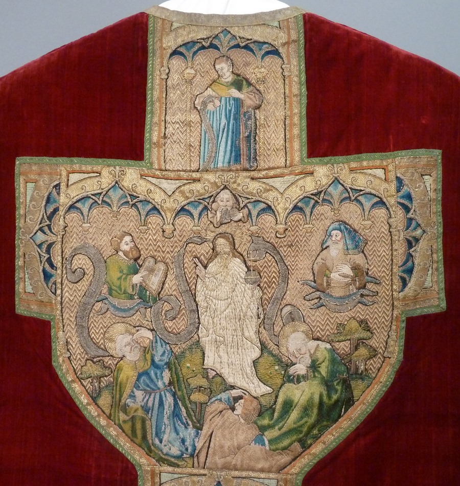 Rood kazuifel met verheerlijking Christus op de berg Thabor, met Petrus, Johannes, Jacobus