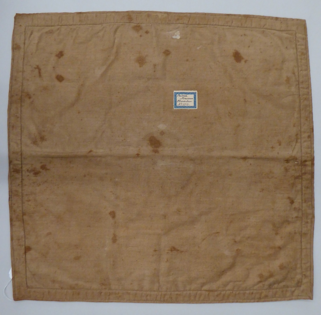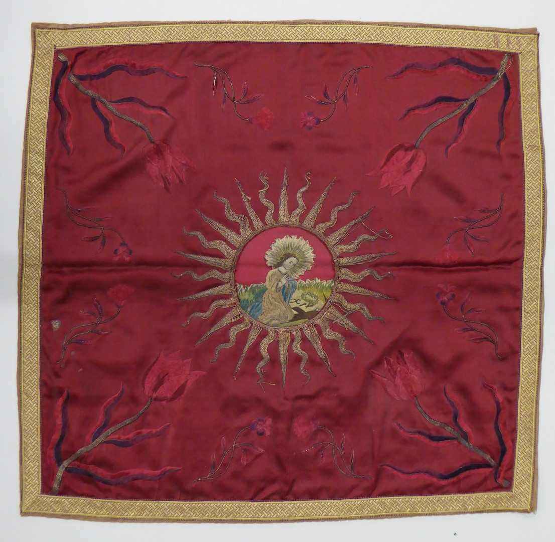 Rood kelkvelum met geborduurde tulpen, violen en anjers, vrouwelijke heilige met lijdenswerktuigen