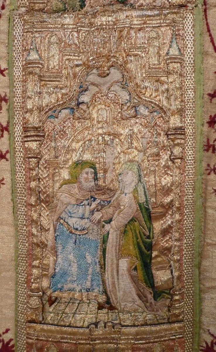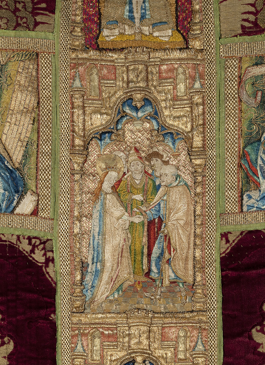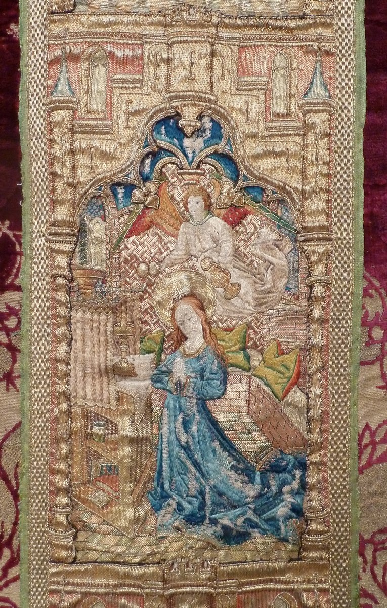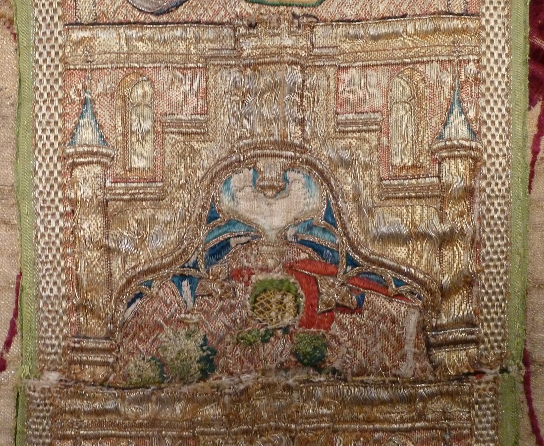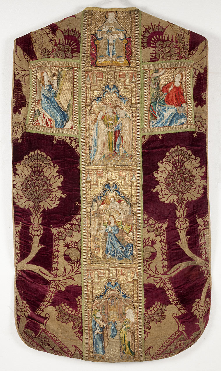 Het kazuifel in vioolvorm is van wijnrood zijdefluweel gebrocheerd met gouddraad in granaatappelpatroon met daartussen trossen met drie granaatappels. Het borduurwerk op de achterkant heeft de vorm van een latijns kruis en toont onder baldakijnen, steunend op zuilen met pinakels waarachter twee boogvensters en een middentorentje, taferelen uit het Marialeven. Bovenaan een Genadestoel. Een gezeten ...