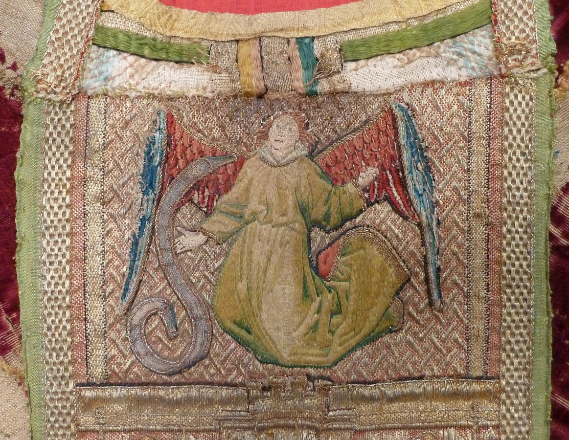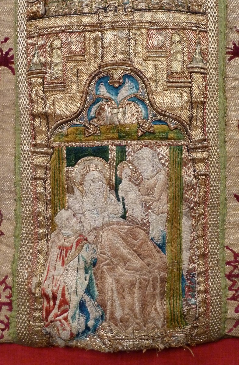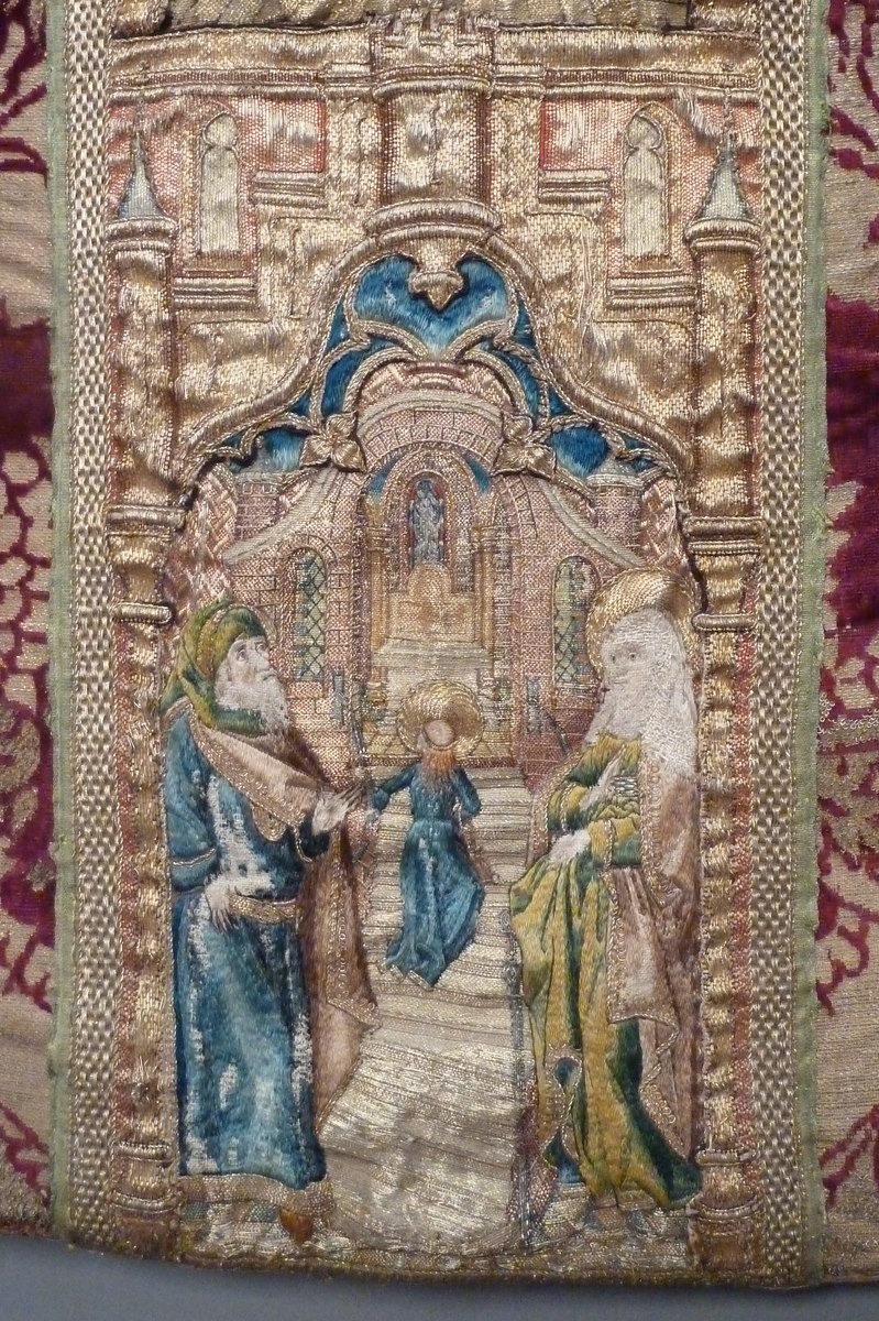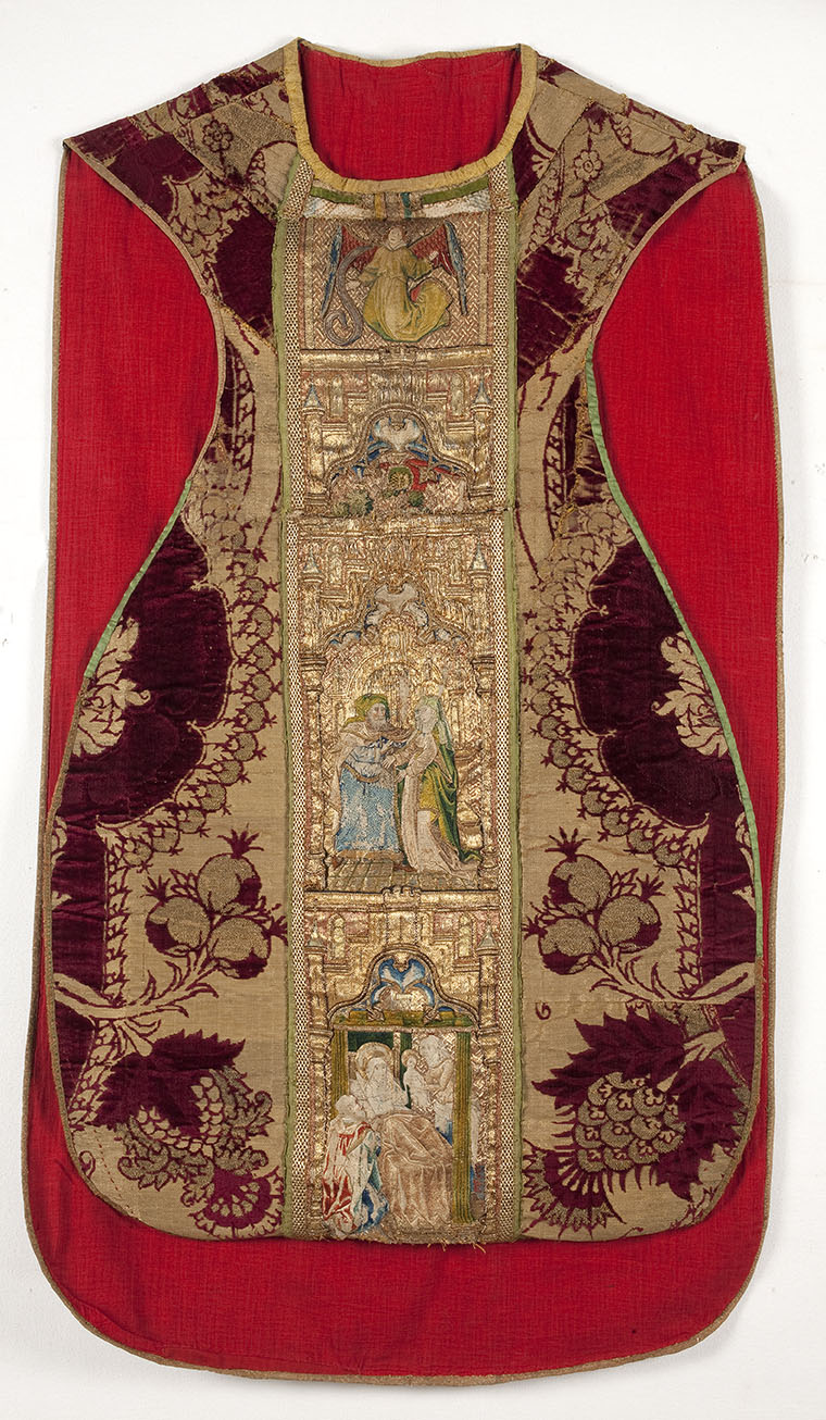 Rood kazuifel met genadestoel en scènes uit het Marialeven