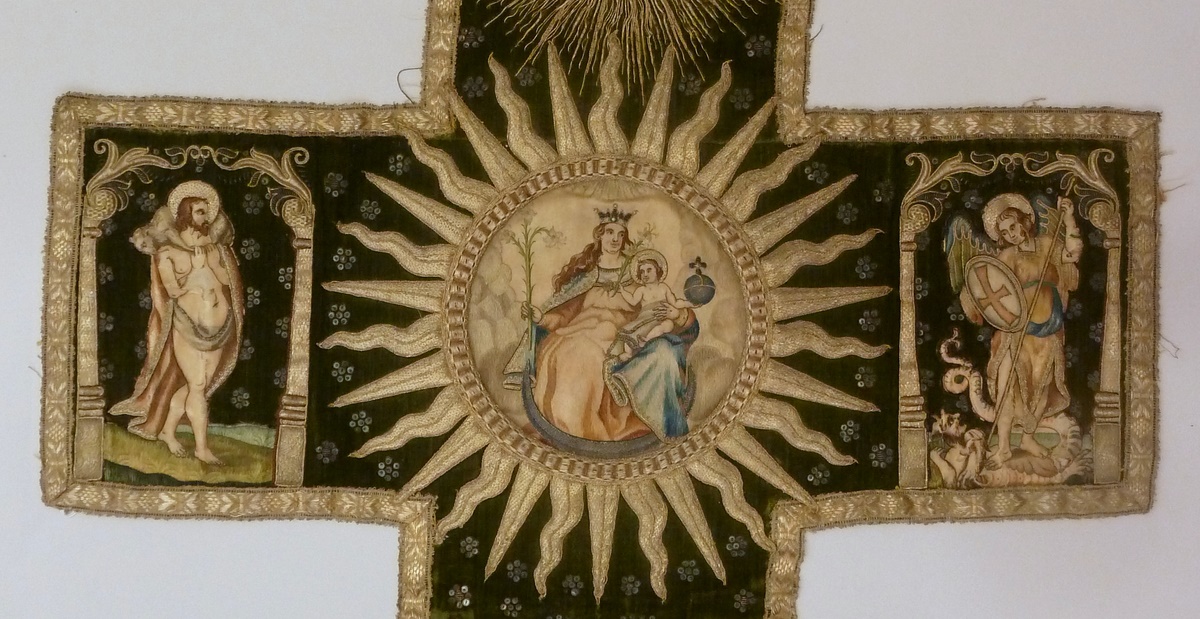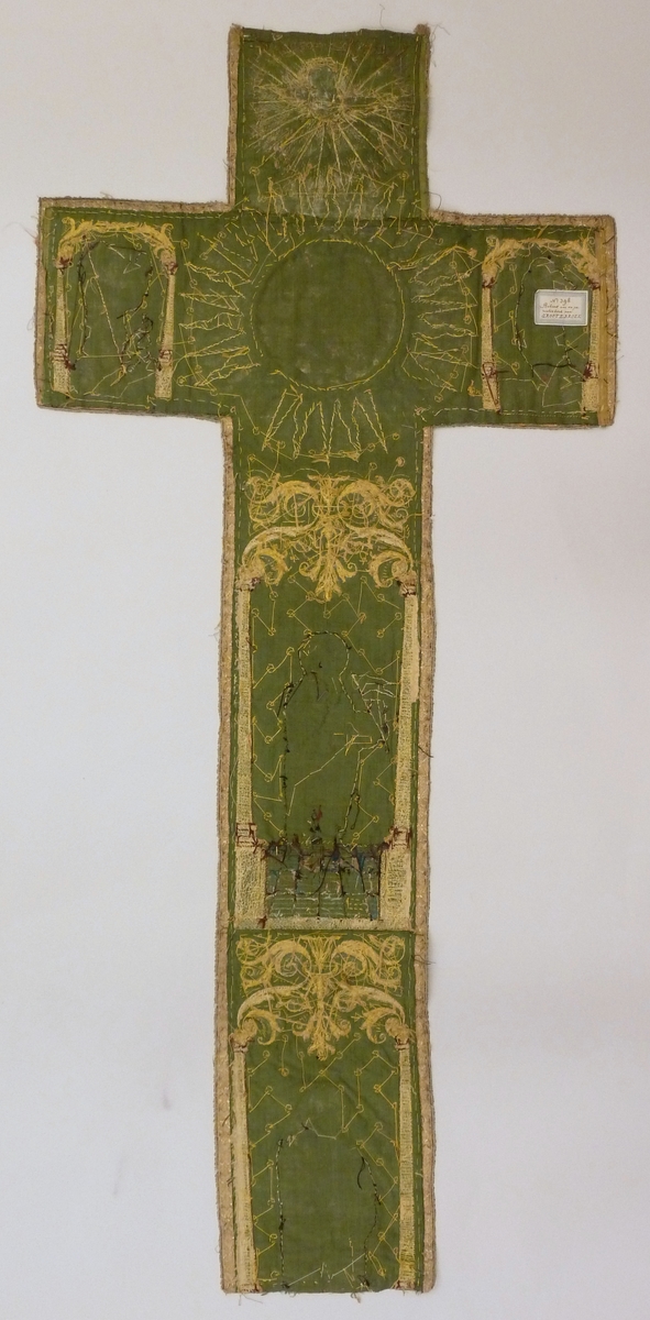 Het kazuifelkruis van groen fluweel, toont centraal een medaillon met stralenkrans, waarin Maria gezeten is als gekroonde hemelse koningin met het Christuskind op de schoot. Onder haar voeten de maansikkel. Christus draagt de rijksappel. Boven het medaillon zweeft de H. Geest in de gedaante van een gouden duif. Links en rechts op het kazuifelkruis zijn ...