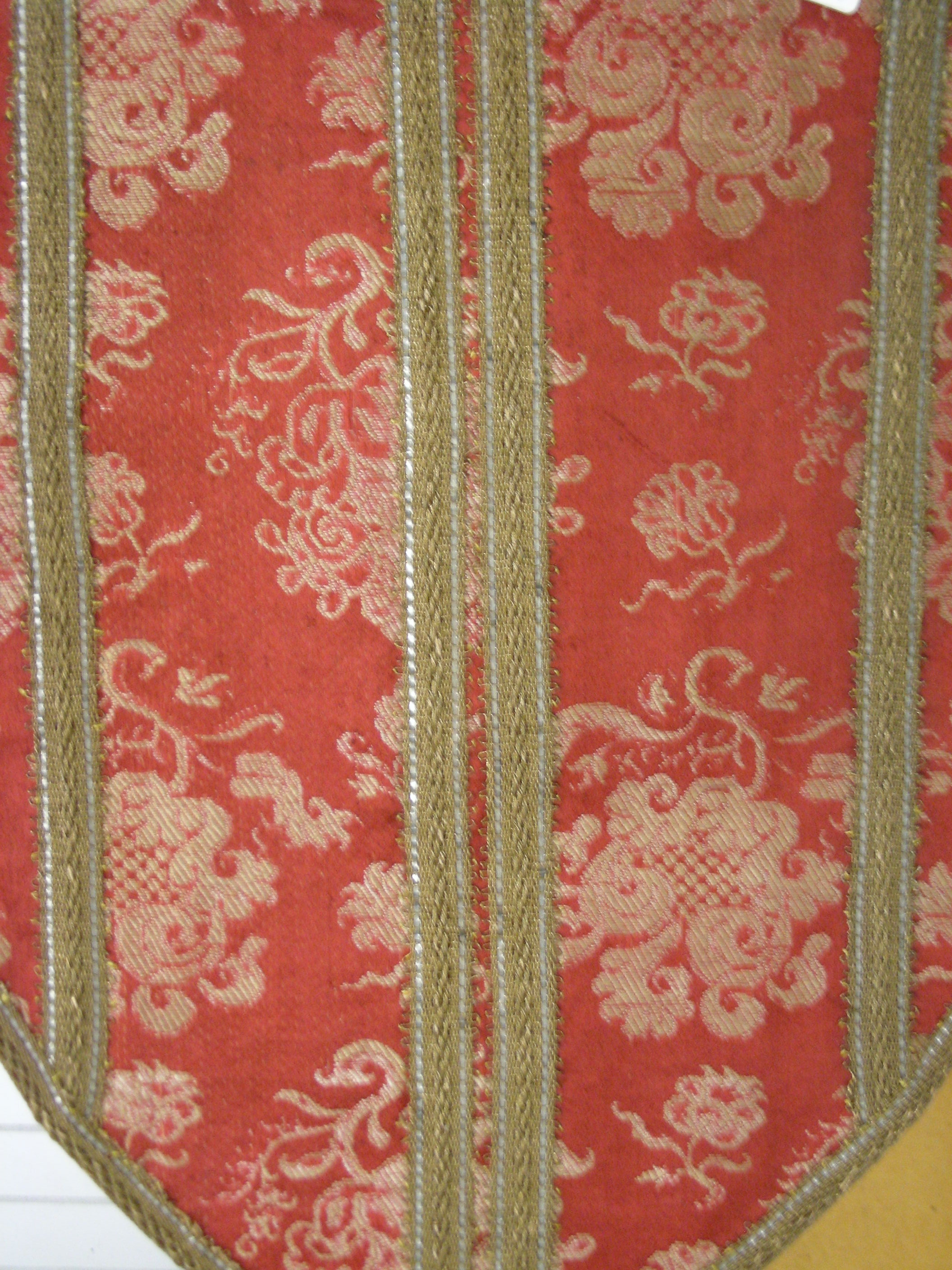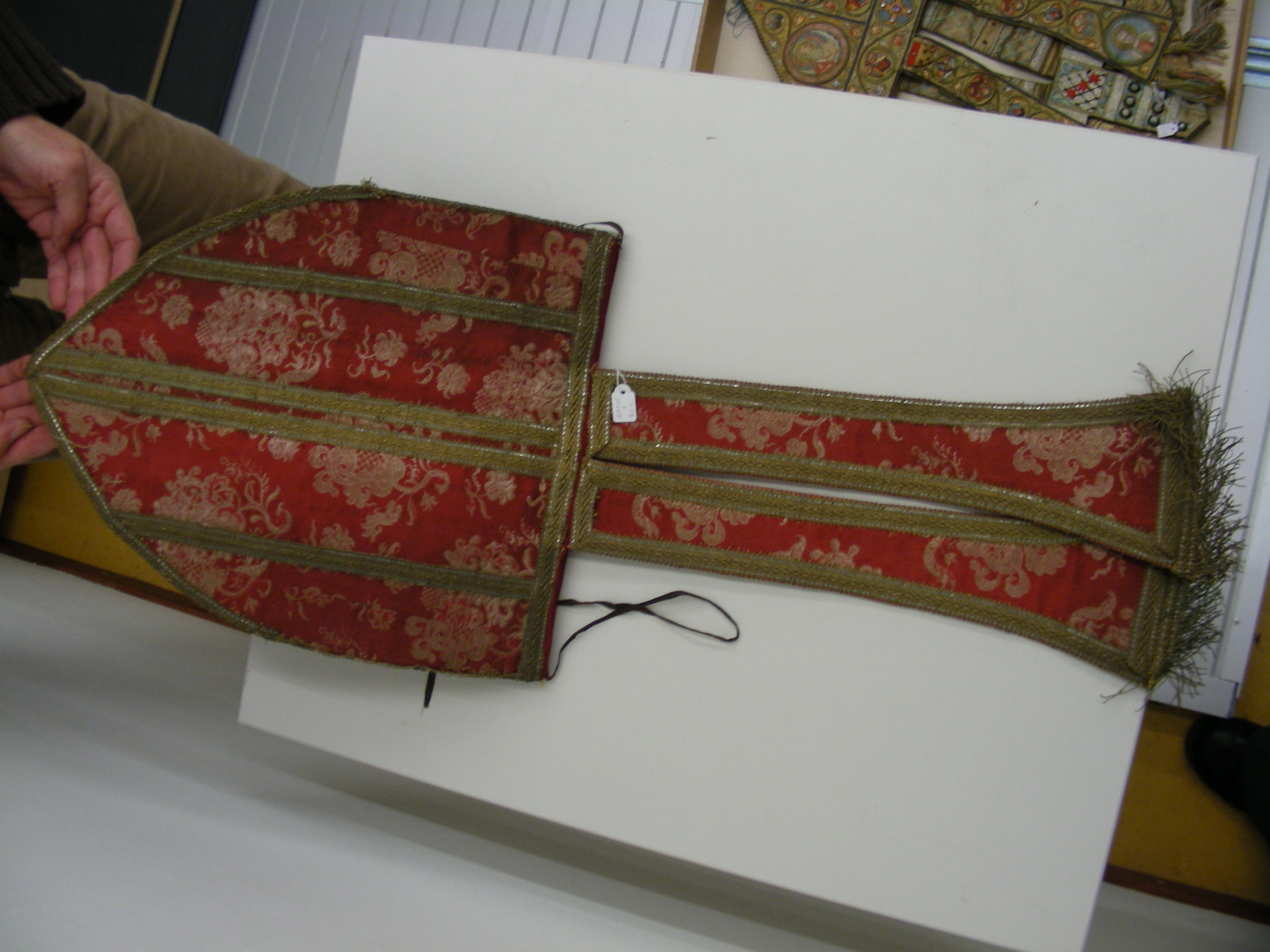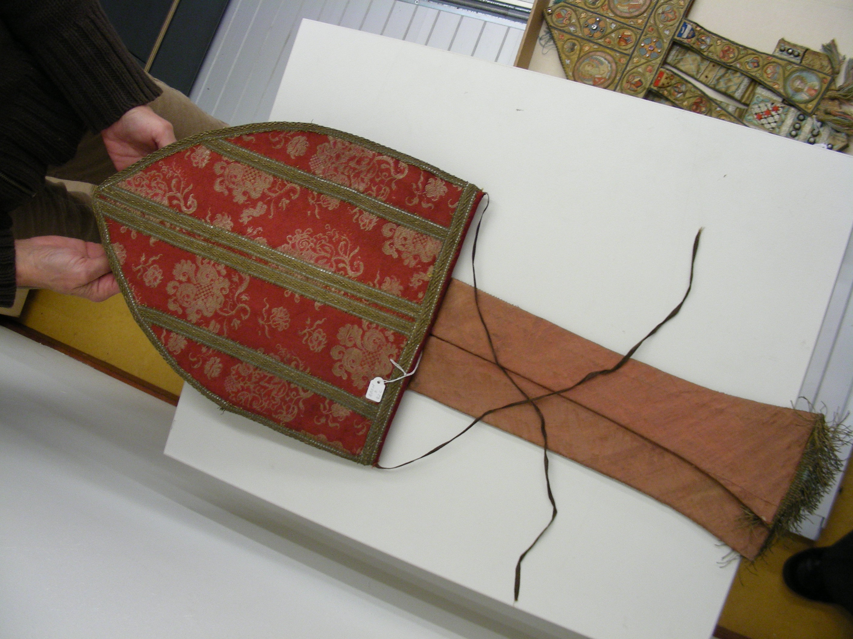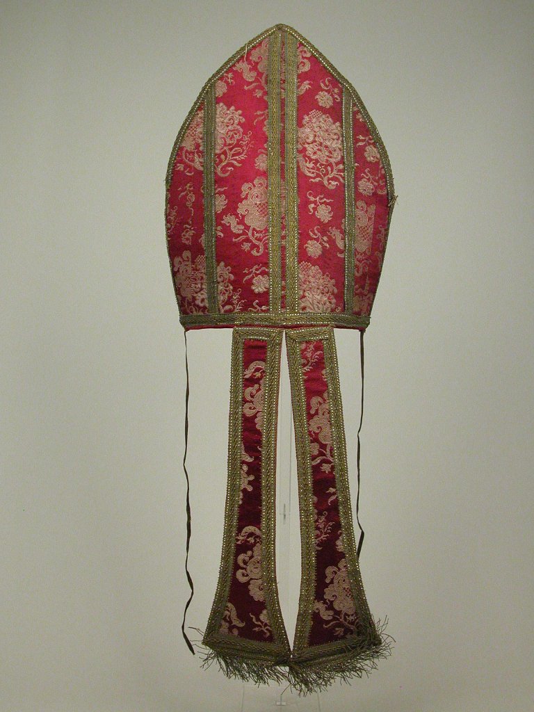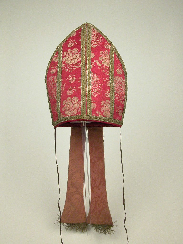 De mijter is van rode damastzijde, waarin bloemmotieven zijn geweven (gestyleerde granaatappels?). De voor- en de achterkant bestaan uit vier banen damast, door galon van elkaar gescheiden.