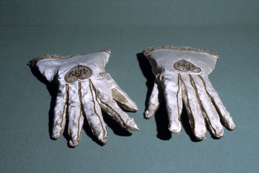 Witte rechterhandschoen met gouddraad hart waarin IHS met drie nagels