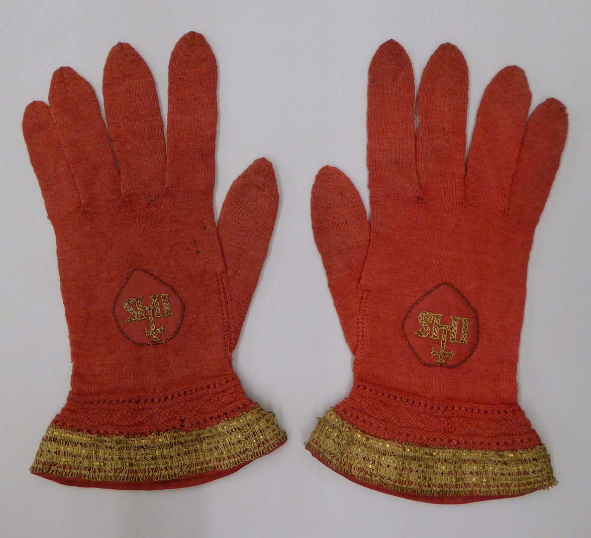 Rode gebreide linkerhandschoen met gouddraad IHS in satijnen hartje, met boord van goudgalon