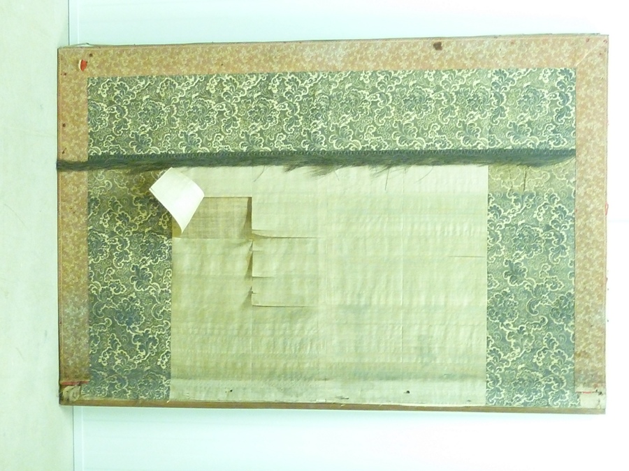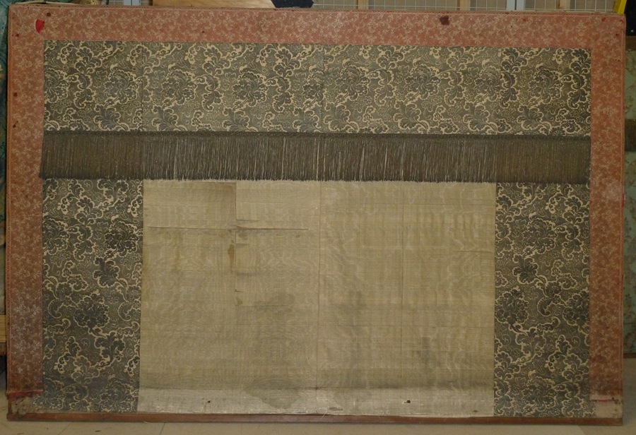 Wit antependium met brede blauwe band en franjerand, met rode band waarop kant aan de zijden