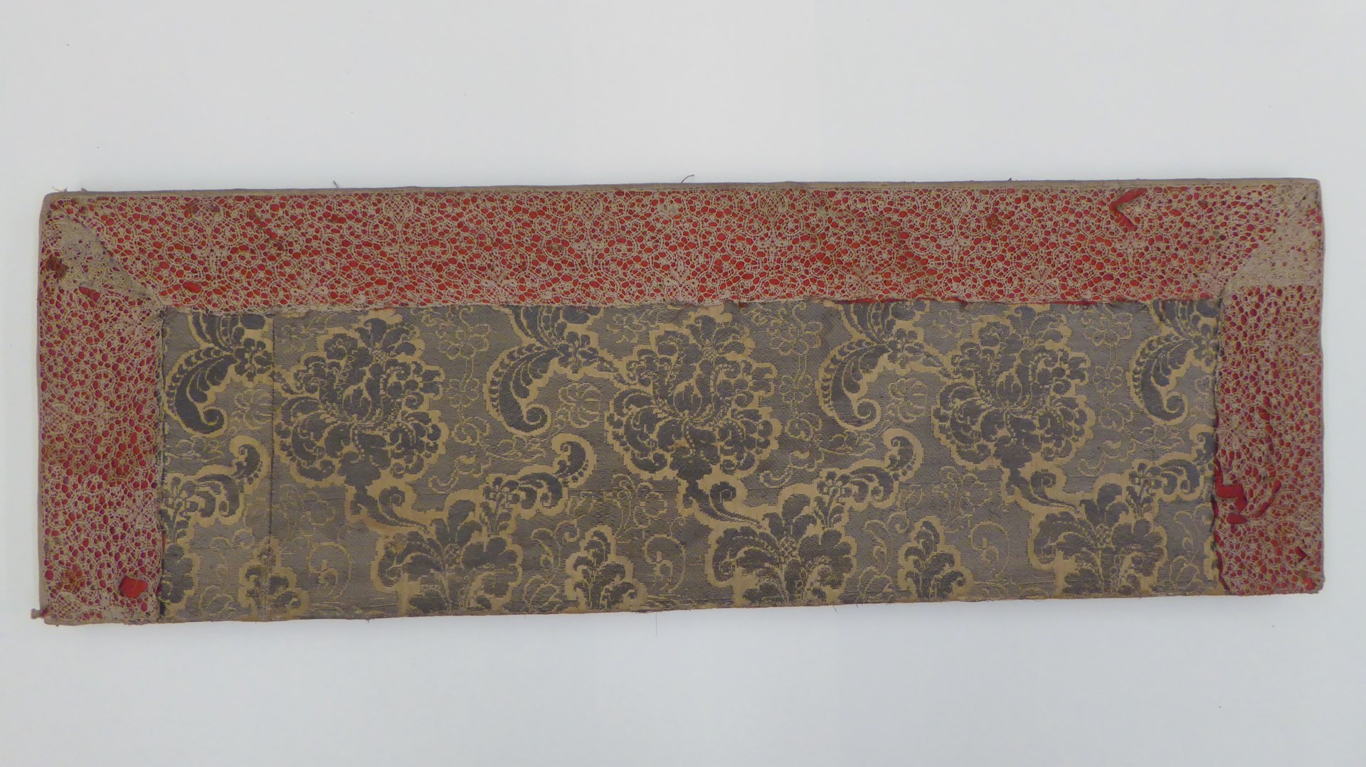 Blauw antependium met bloemmotieven met rode band waarop kant aan de zijden