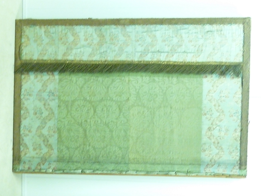 Groen antependium in twee verschillende stoffen met bloempatroon, met franjerand, galon aan zijden