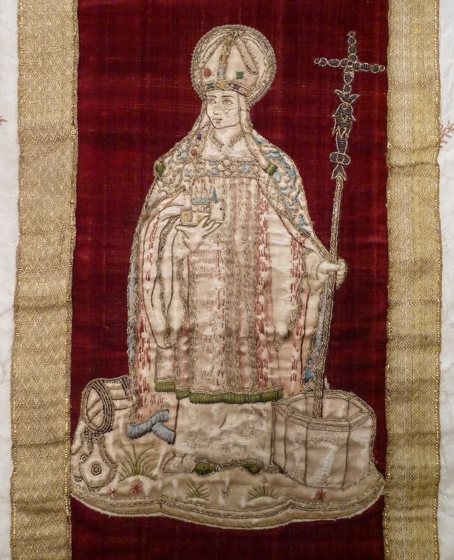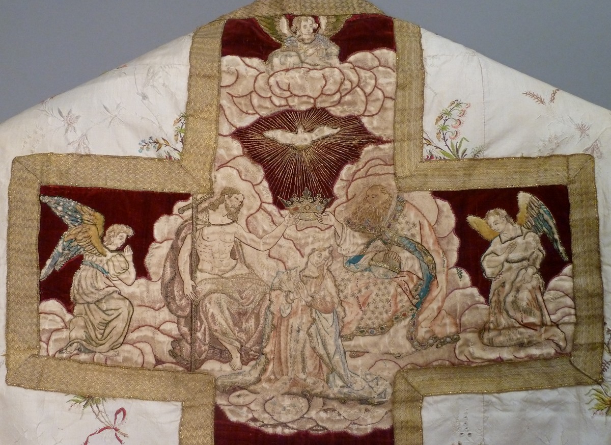 Het borduurwerk op de rug van het kazuifel bestaat uit drie taferelen, die op een rood fluwelen kruis zijn geappliceerd. Bovenaan een verhalende scène met de kroning van Maria. In een wolkenhemel zien we een knielende Maria met de handen gevouwen, die door de Vader en de Zoon gekroond wordt. Boven hen zweeft de H. ...