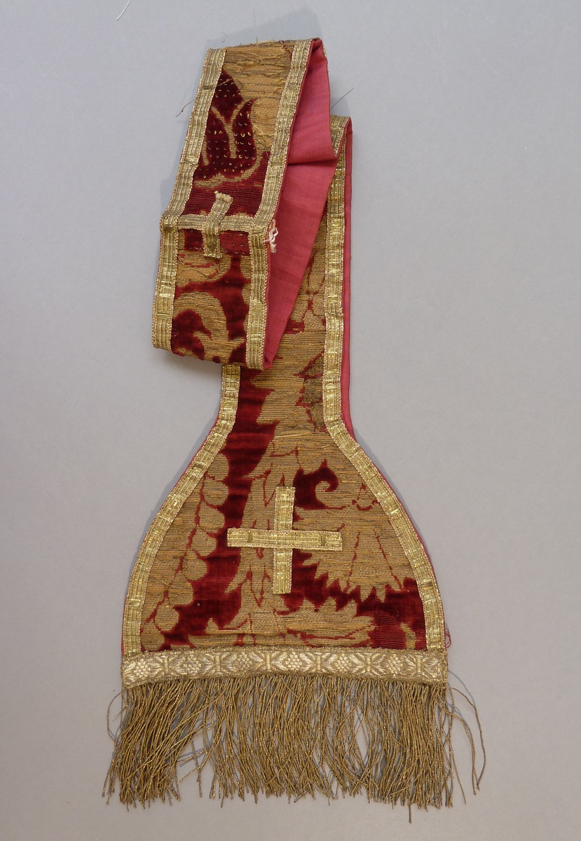 Rode manipel met geschoren fluweel, gouddraad granaatappels met goudgalon kruisjes en rand