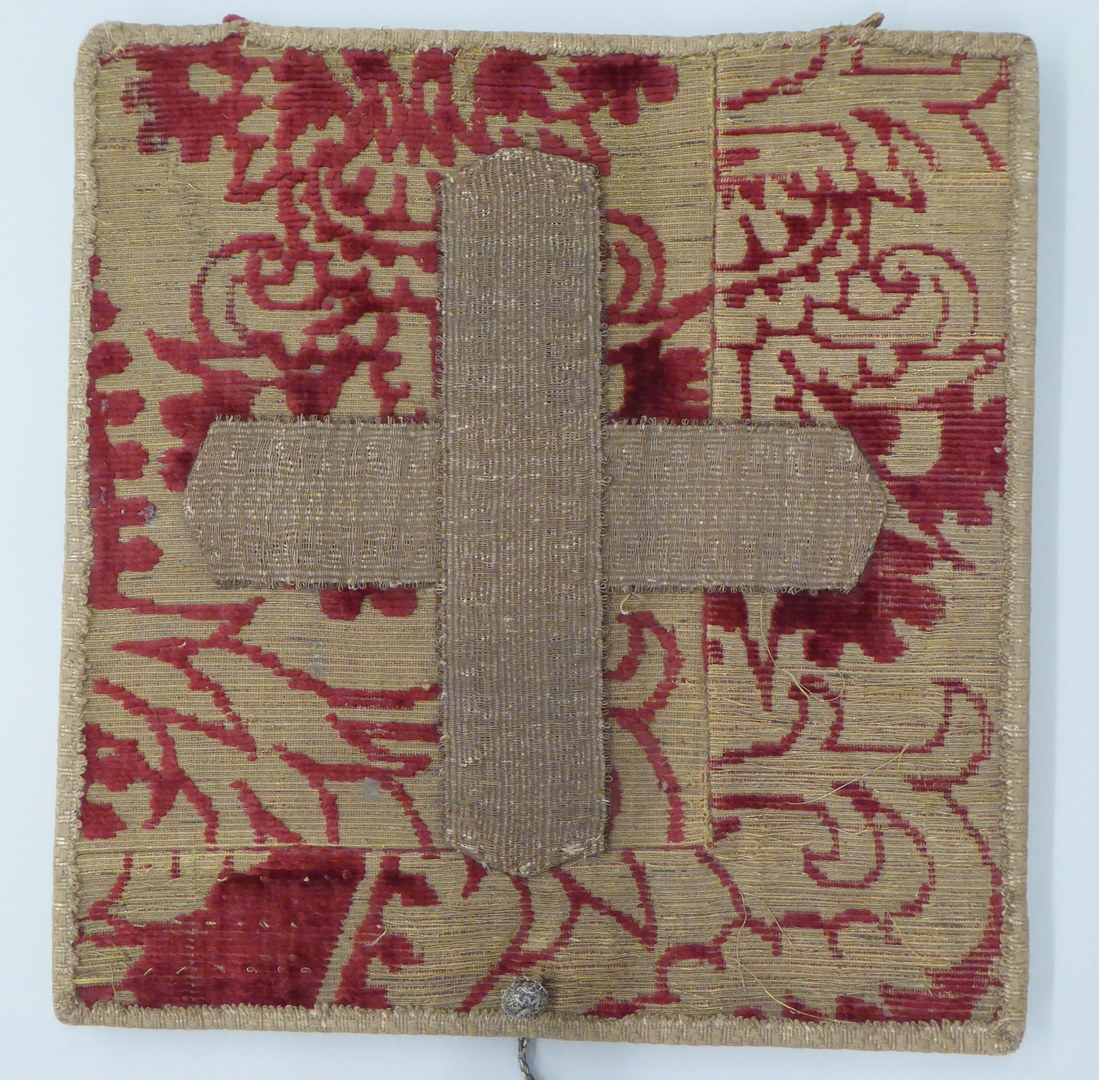 Rode beurs met granaatappelpatroon, kruis van goudgalon