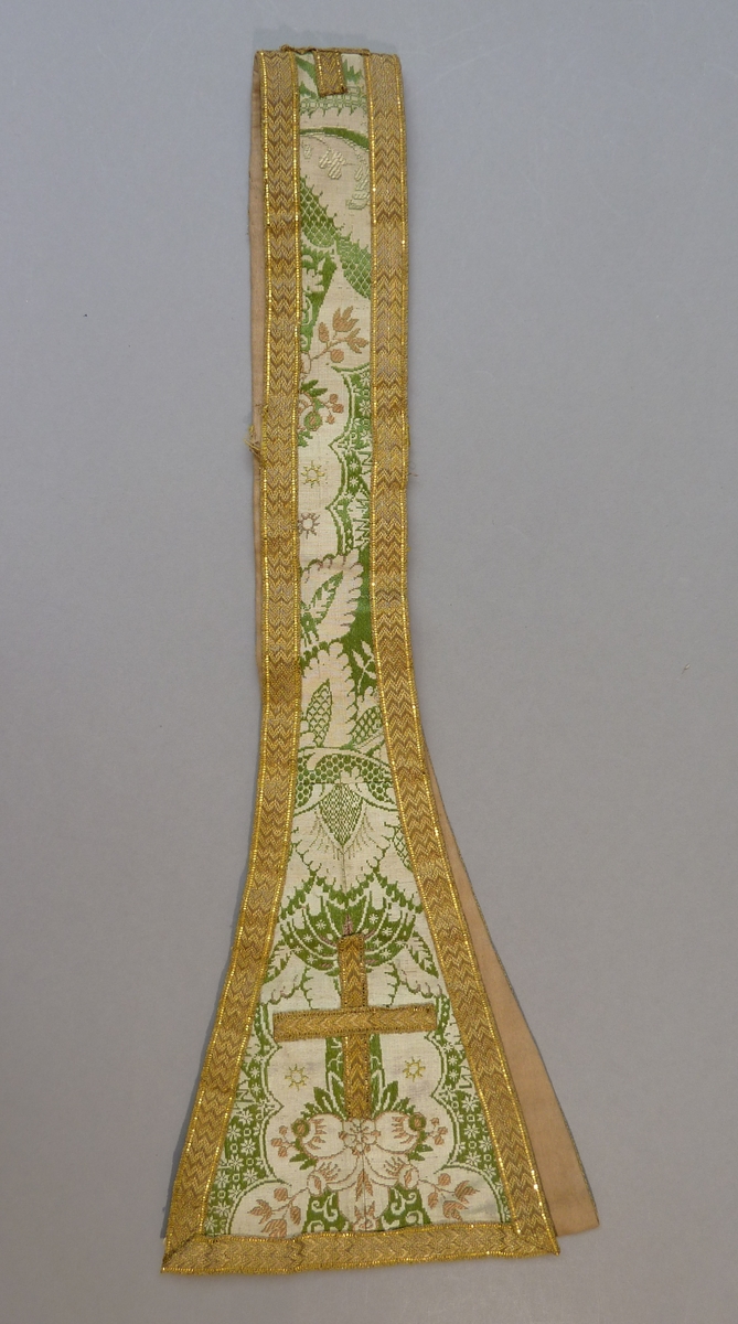 Groene manipel met ingeweven bloempatroon, goudgalon kruisjes en rand