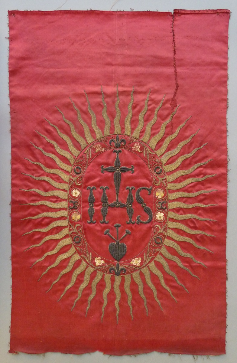 Rode lap met IHS borduurwerk in vlammen