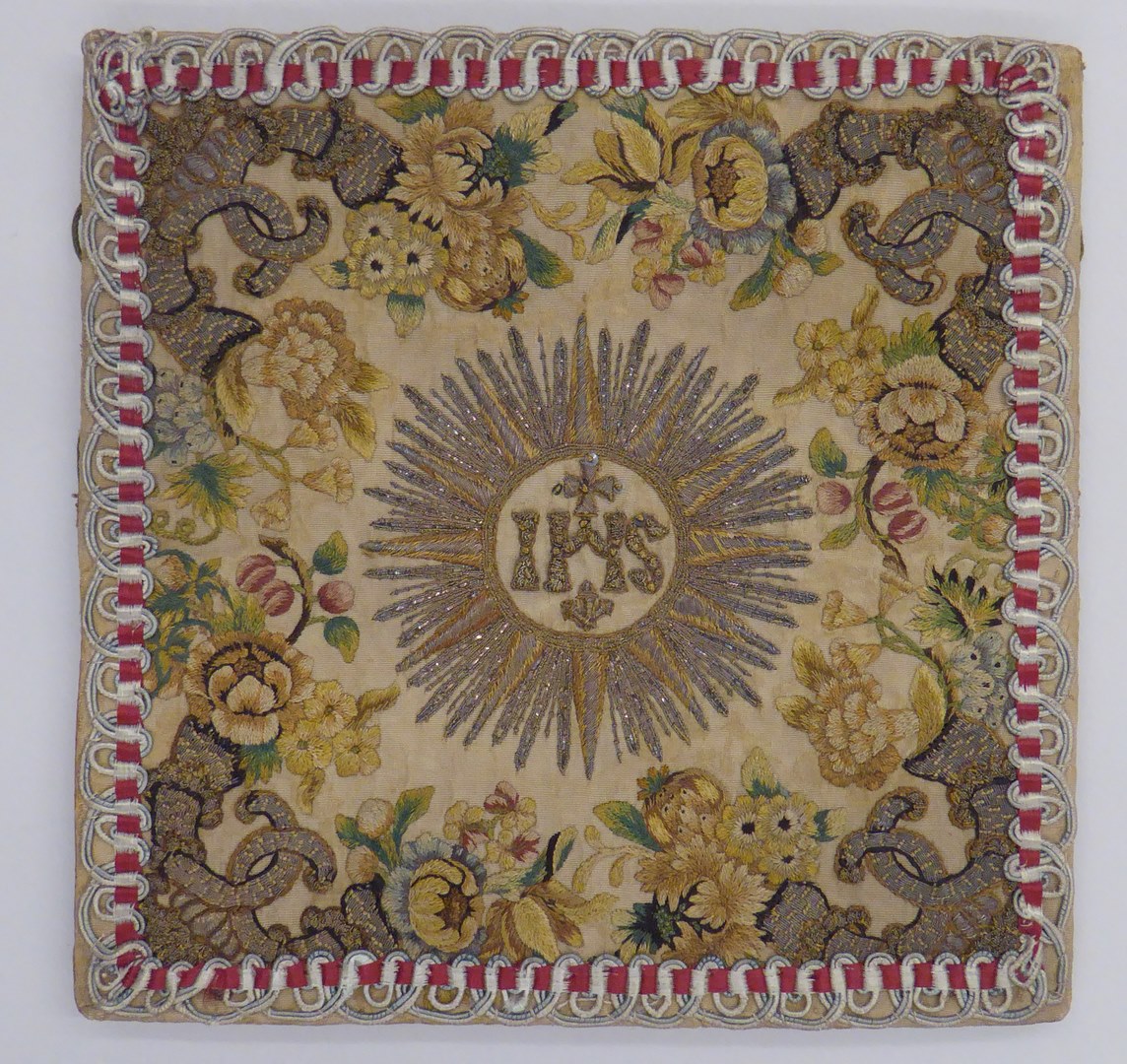Witte beurs geborduurd met cornucopiae en bloemranken, IHS in stralenkrans