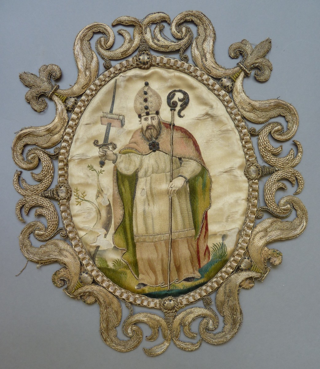 In een ovaal medaillon wordt in een landschap en face de gebaarde bisschop en missionaris Bonifatius uitgebeeld. Hij gaat gekleed in bisschoppelijk ornaat: koormantel, albe en mijter, en houdt de bisschopsstaf in de linkerhand. Met de rechterhand houdt hij een zwaard omhoog, dat een boek doorboord heeft. Het medaillon heeft een gouden sierrand van in ...