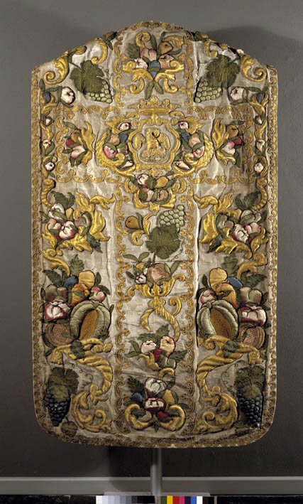 Het kazuifel in vioolvorm is van witte moirézijde. De versieringen zijn over het gehele gewaad aangebracht. Ze bestaan uit hoog opgewerkte ornamenten: dikke gele krullen en kleurige vruchten met groen loof: opengebarsten granaatappels, druiventrossen, granaatappels, peren en pruimen, en acanthusbladeren. Centraal op de achterkant in een bekroonde catrouche met régence-omlijsting een pelikaan met wijd gestrekte ...