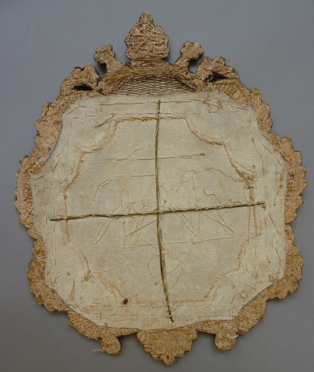 Blauw medaillon met monogram van de H. Maria in zilverdraad
