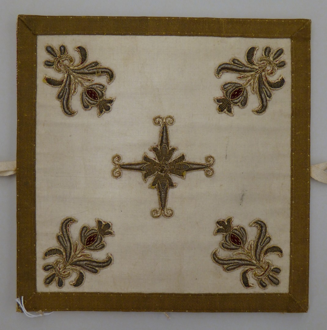 Witte beurs geborduurd met kruisje en lelies van gehoogd gouddraad