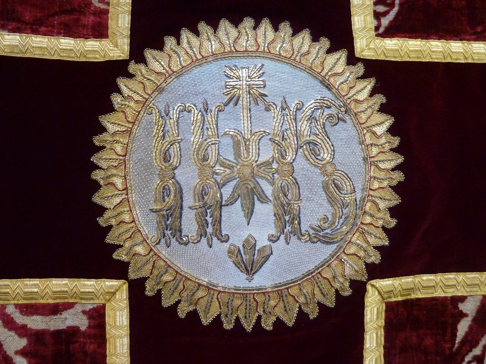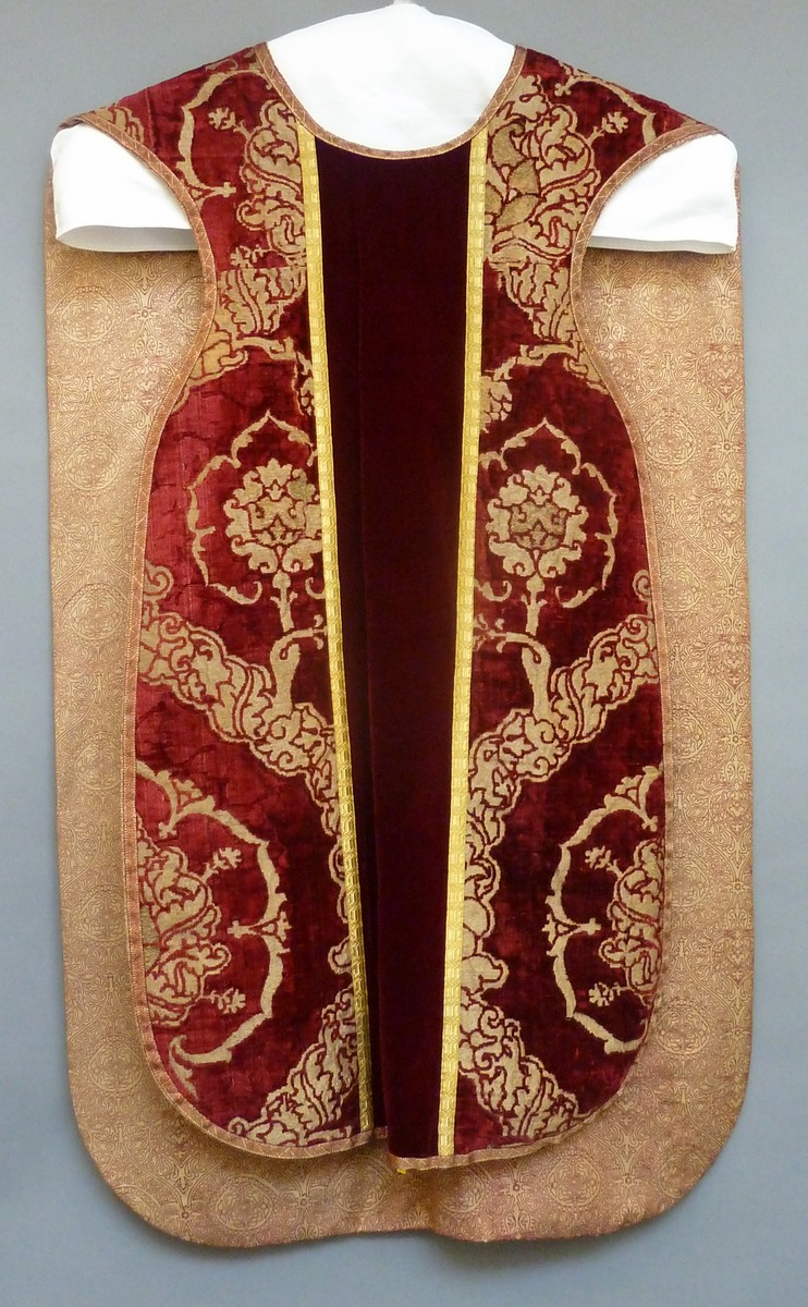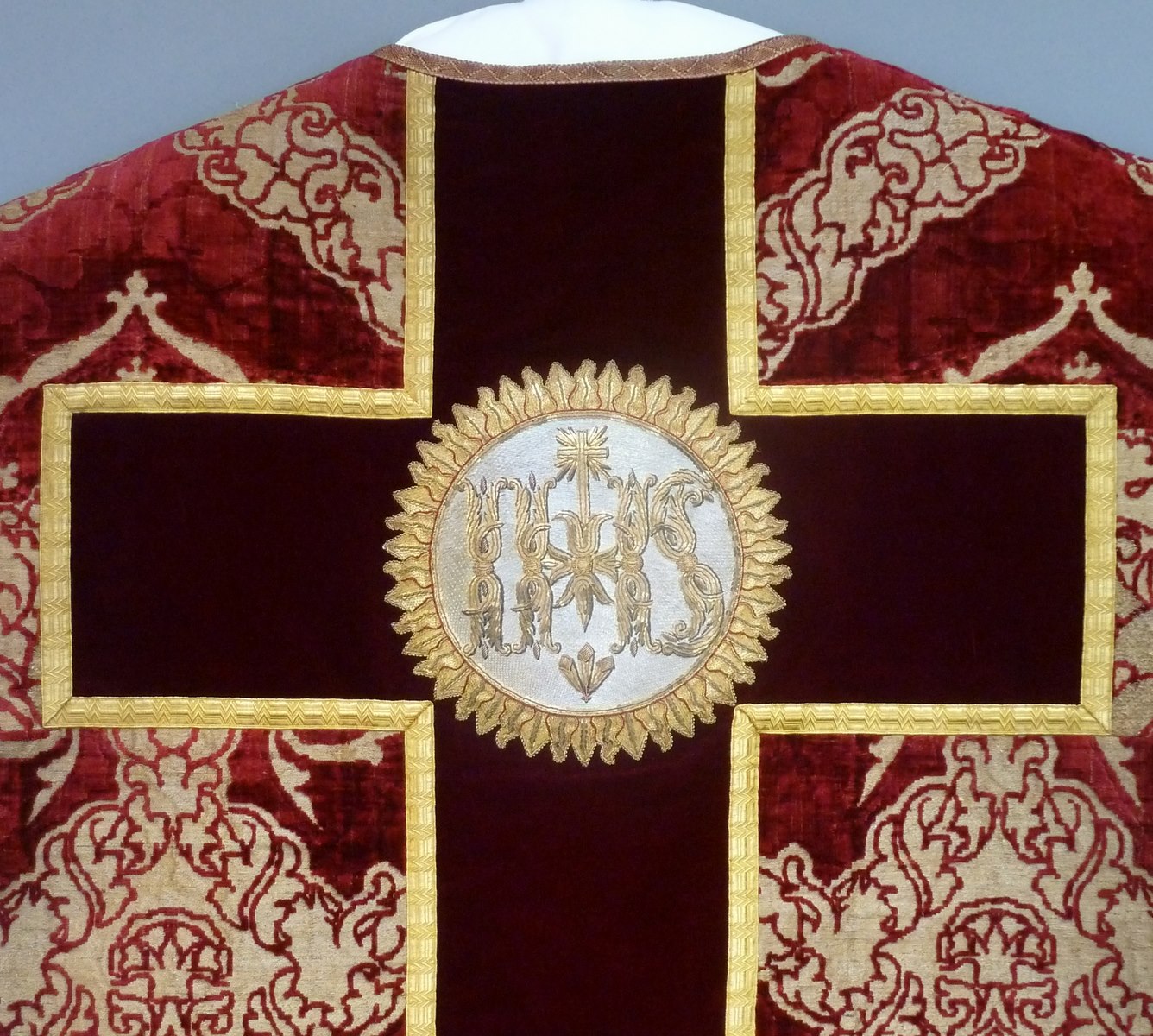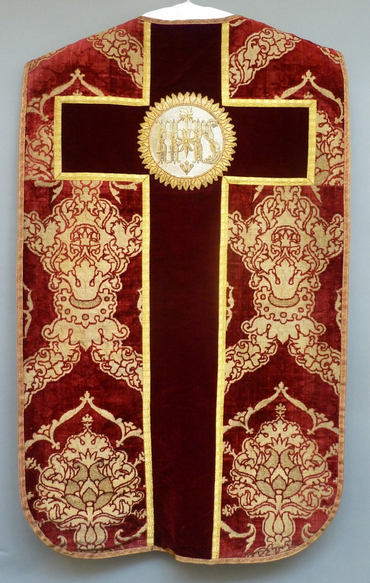 Rood kazuifel met vernieuwde stroken fluweel en nieuw galon, uitgeschoren brokaat, IHS op kruis