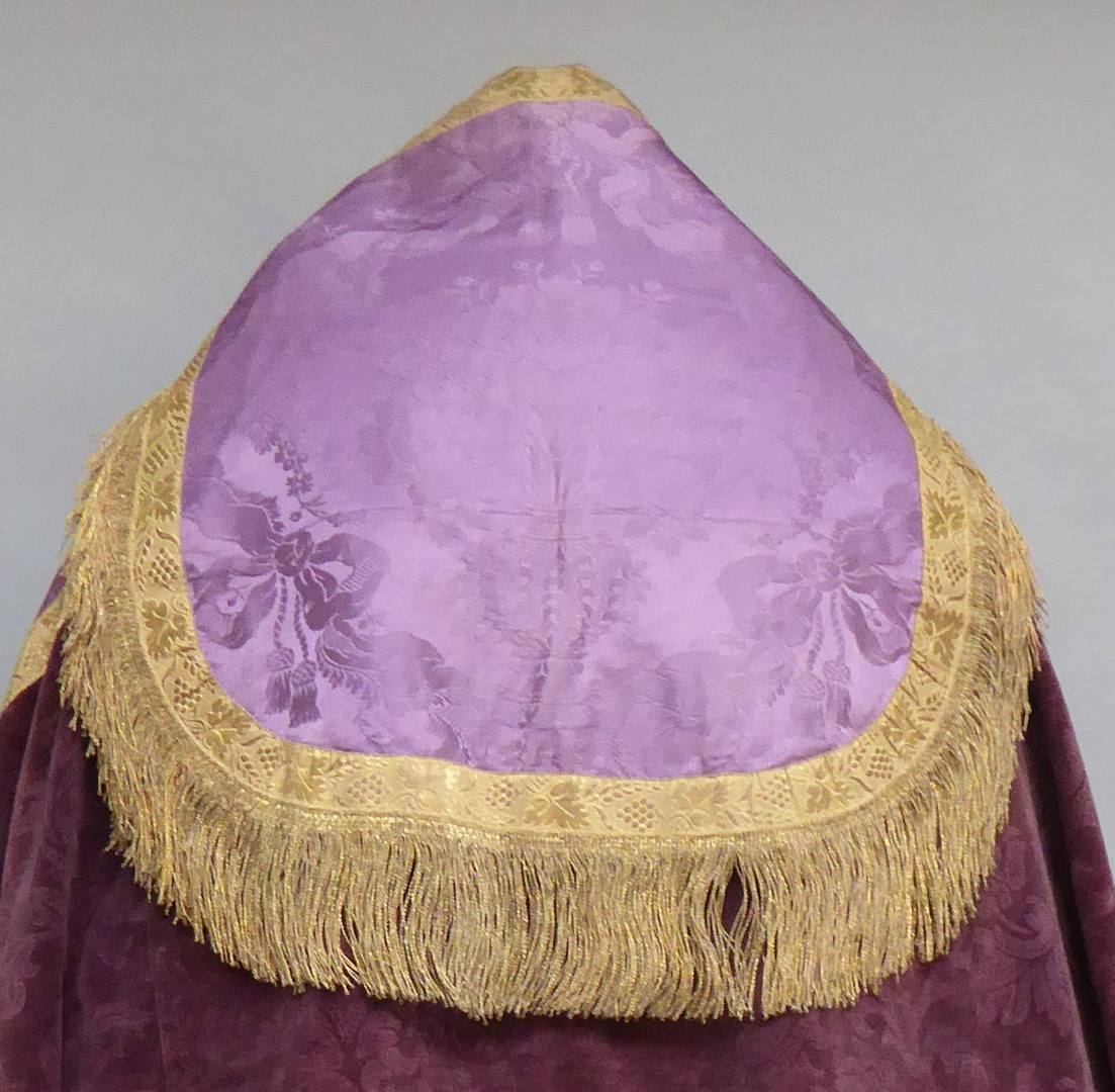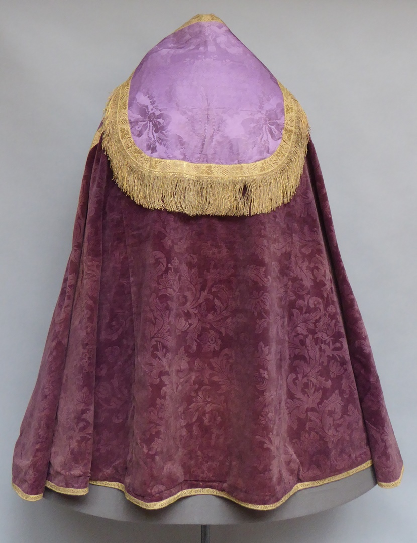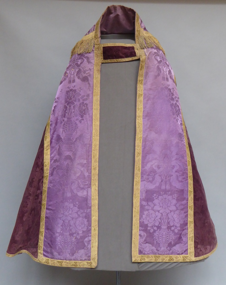 Paarse koorkap met ranken en paars schild met ingeweven bloemvazen