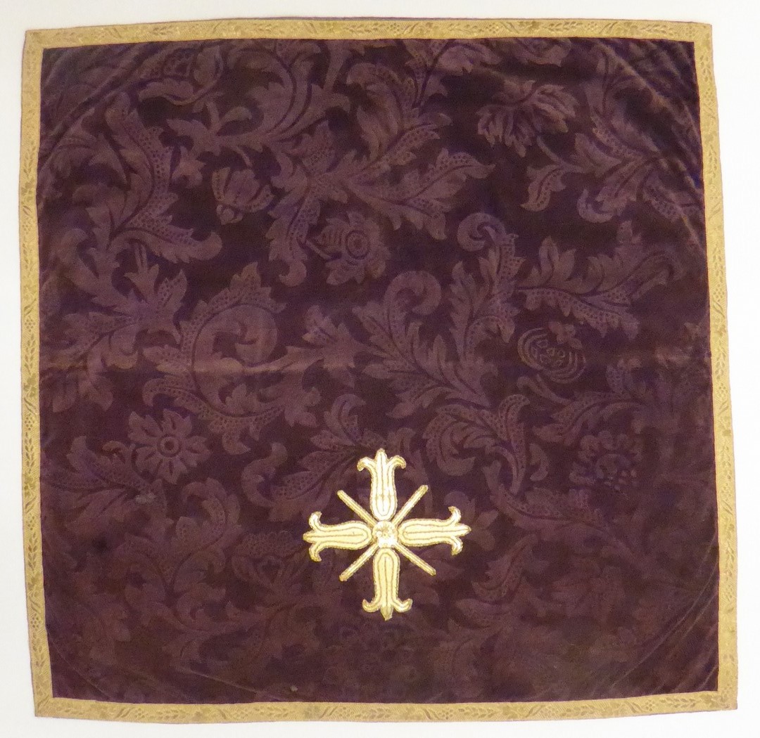 Paars kelkvelum met ingeperst rankenmotief, kruis van pailetten