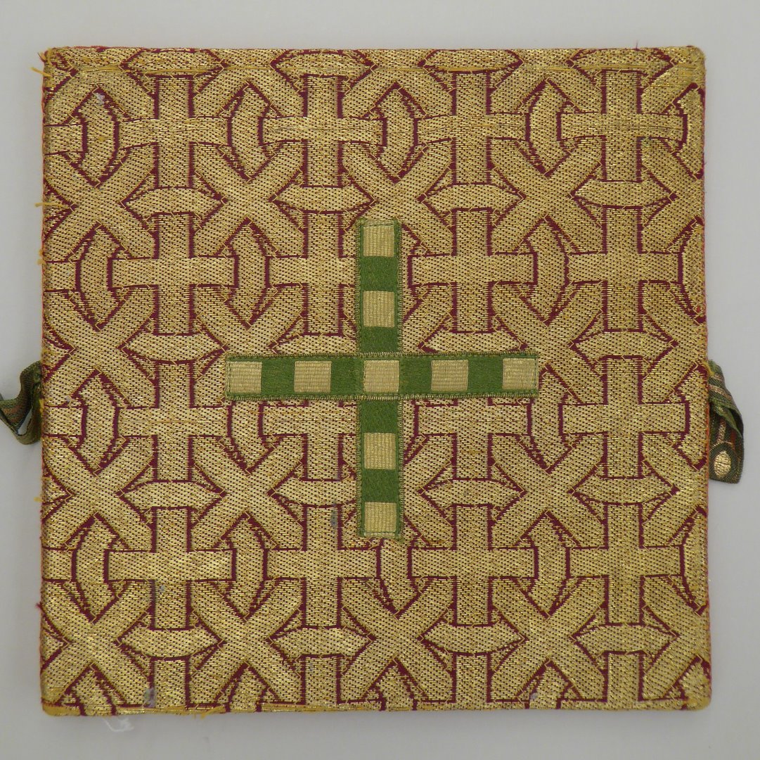 Goudkleurige beurs met rood patroon van kruisen in cirkels, groen-gouden kruisje