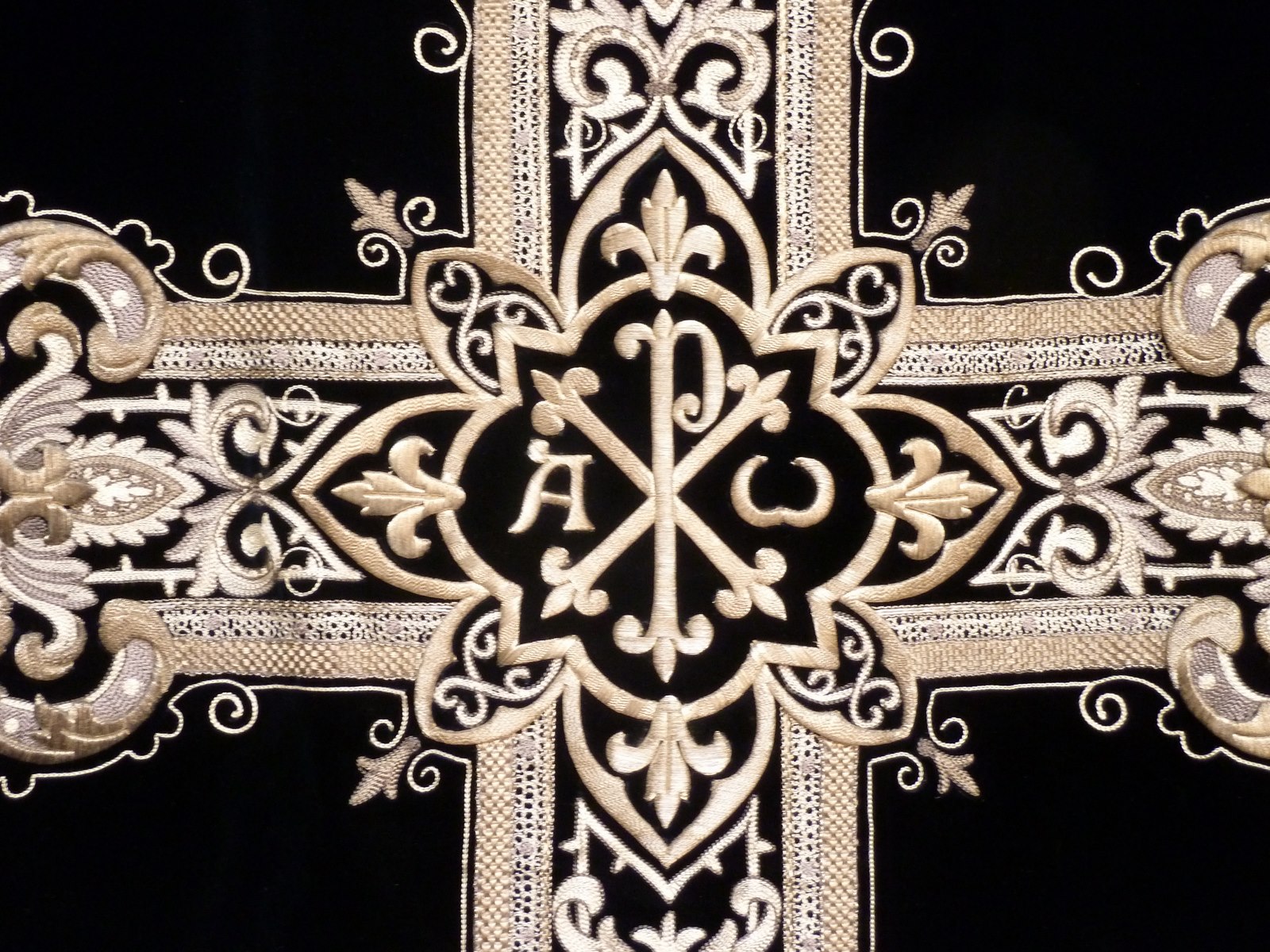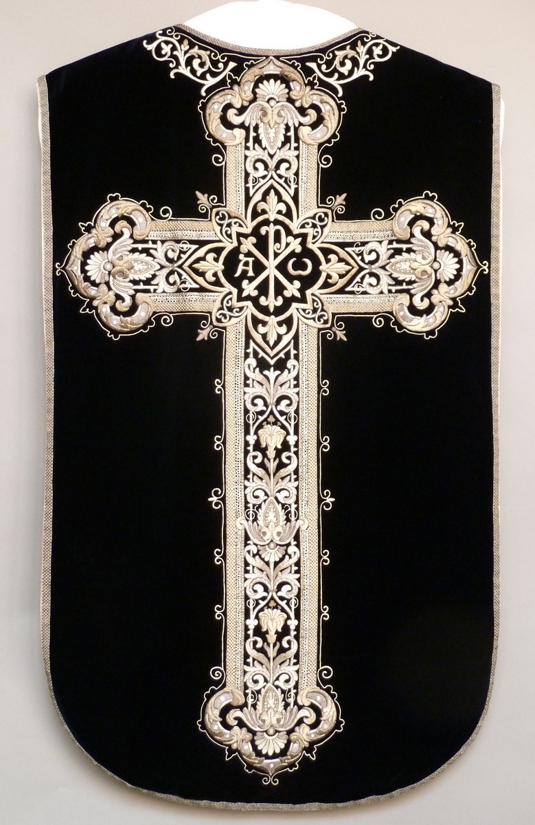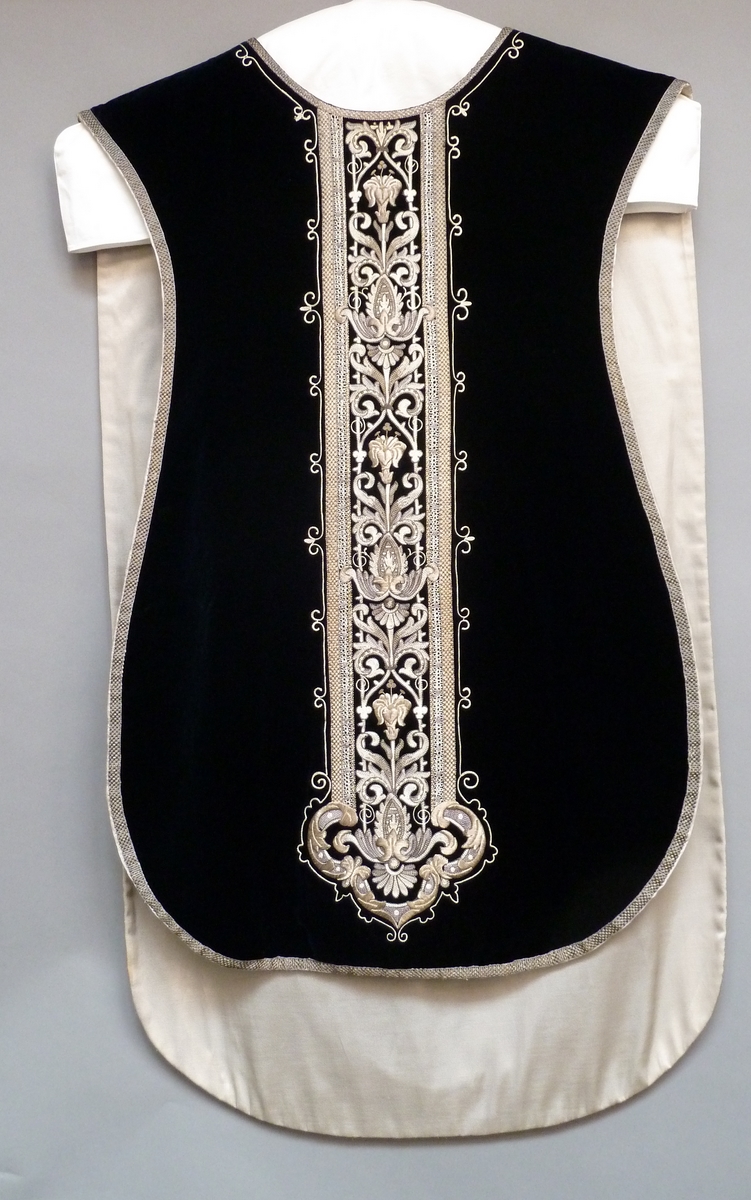 Zwart kazuifel met kruis versierd met gestileerde bloemranken