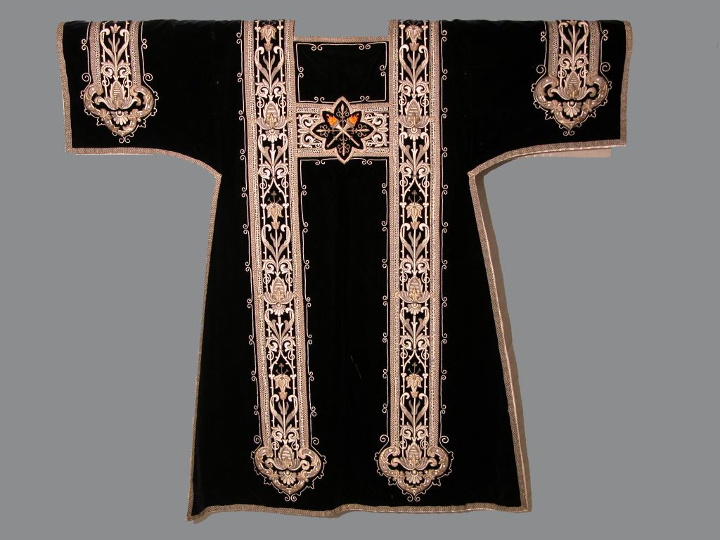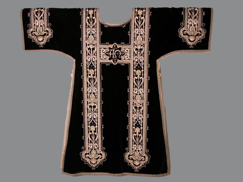 Zwarte dalmatiek met ornamentstroken en gekruiste brandende fakkels, achterop Alfa en Omega