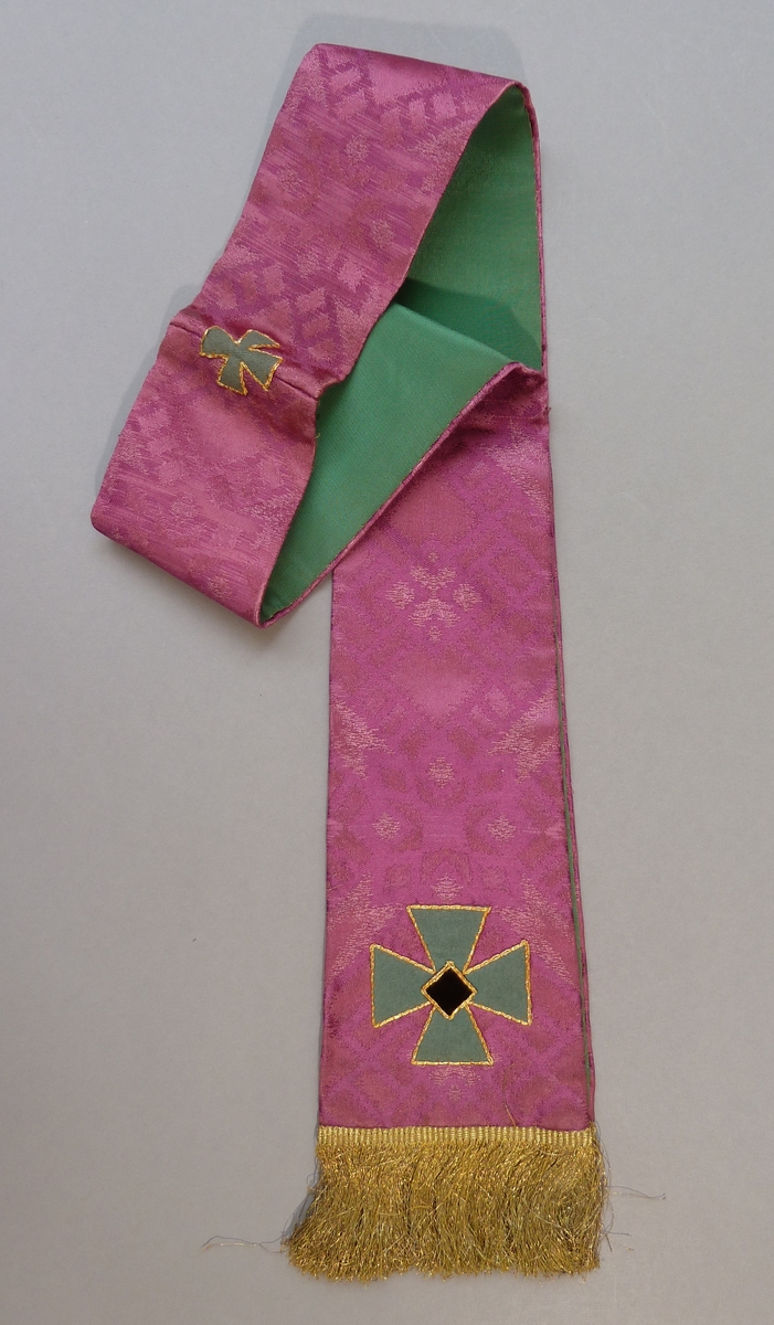 Paarse manipel met ingeweven ruitmotieven en groene geappliceerde kruisjes