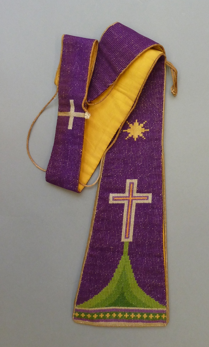 Paarse stola in kruissteek, groene heuvel met kruis waarboven zon