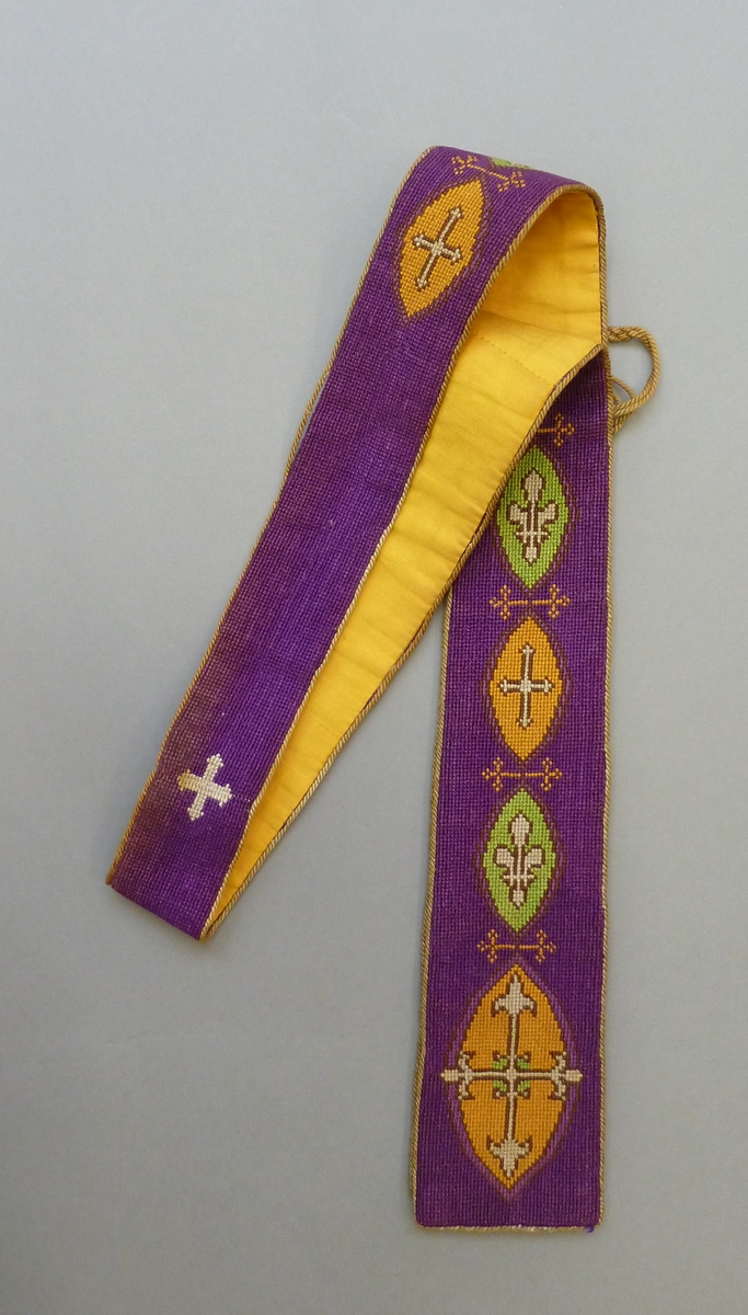 Paarse stola in kruissteek, versmallend ornament waarin kruis, oranje-gele voering