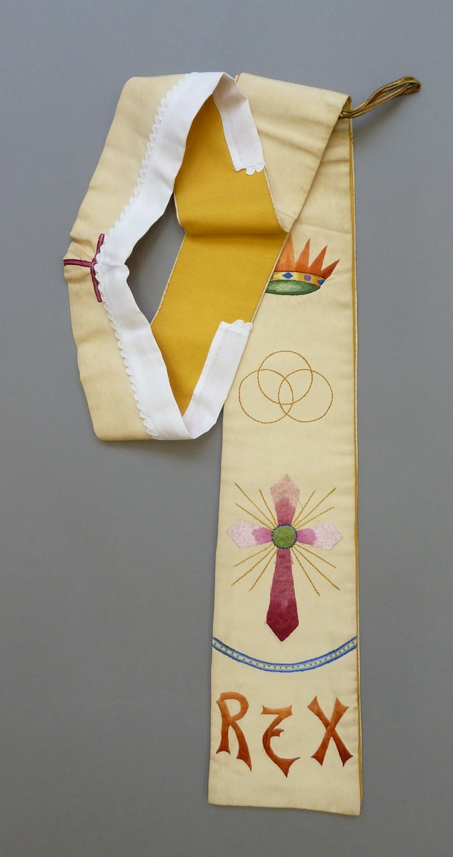 Witte stola met "Rex", stralenkruis, drie cirkels en kroon, voering geel