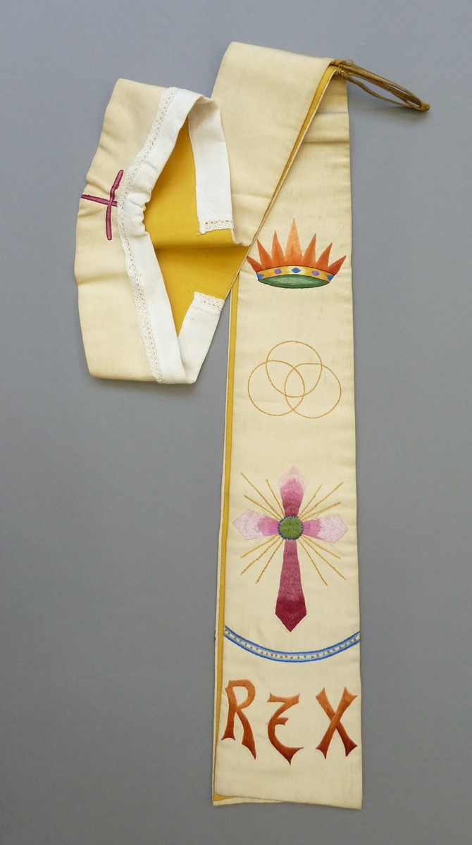Witte stola met "Rex", stralenkruis, drie cirkels en kroon, voering geel