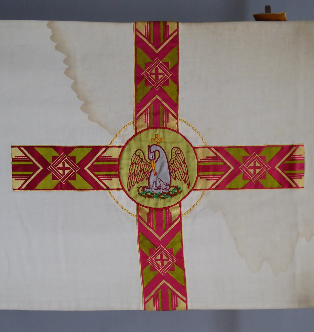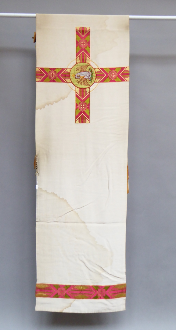 Beige schoudervelum met rode, groene en goudgele banden, medaillon met pelikaan