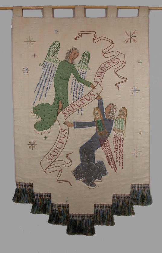 Vaandel waarop twee engelen en drie keer "Sanctus"