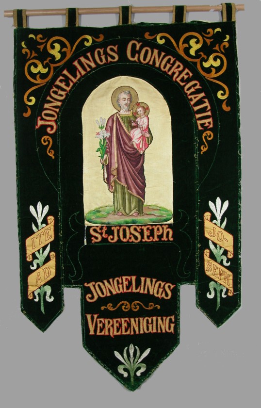 Groen vaandel met H. Jozef en Christuskind, met "Jongelings Congregatie St. Joseph"