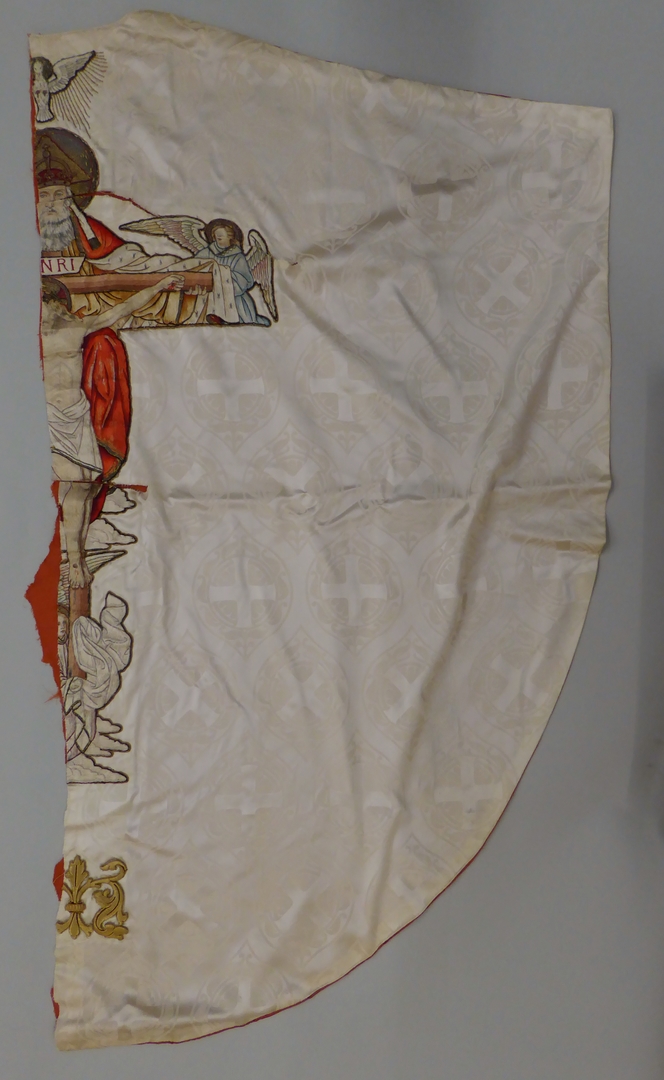 Verknipte helft van wit kazuifel met gekruisigde Christus, God de Vader en H. Geest