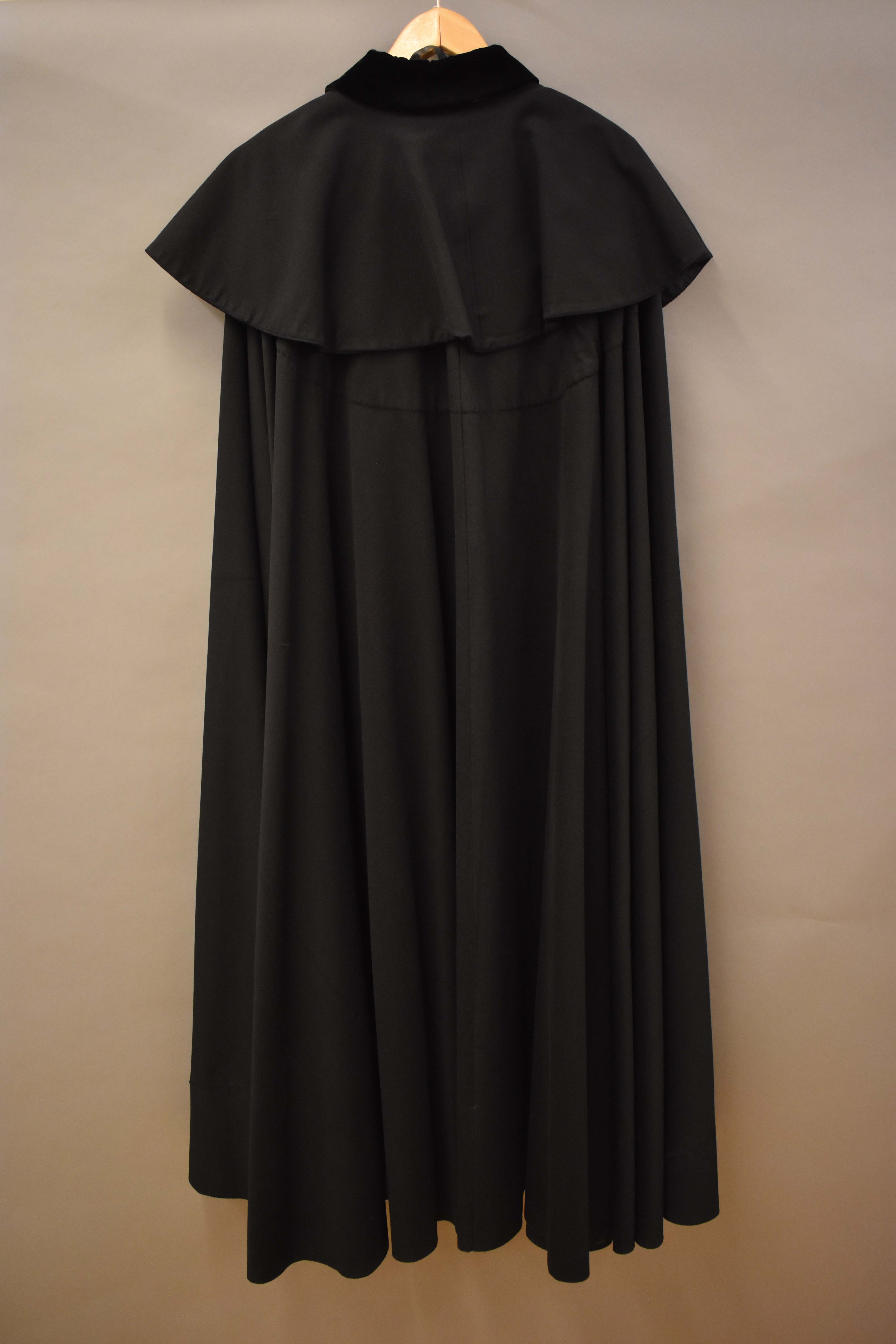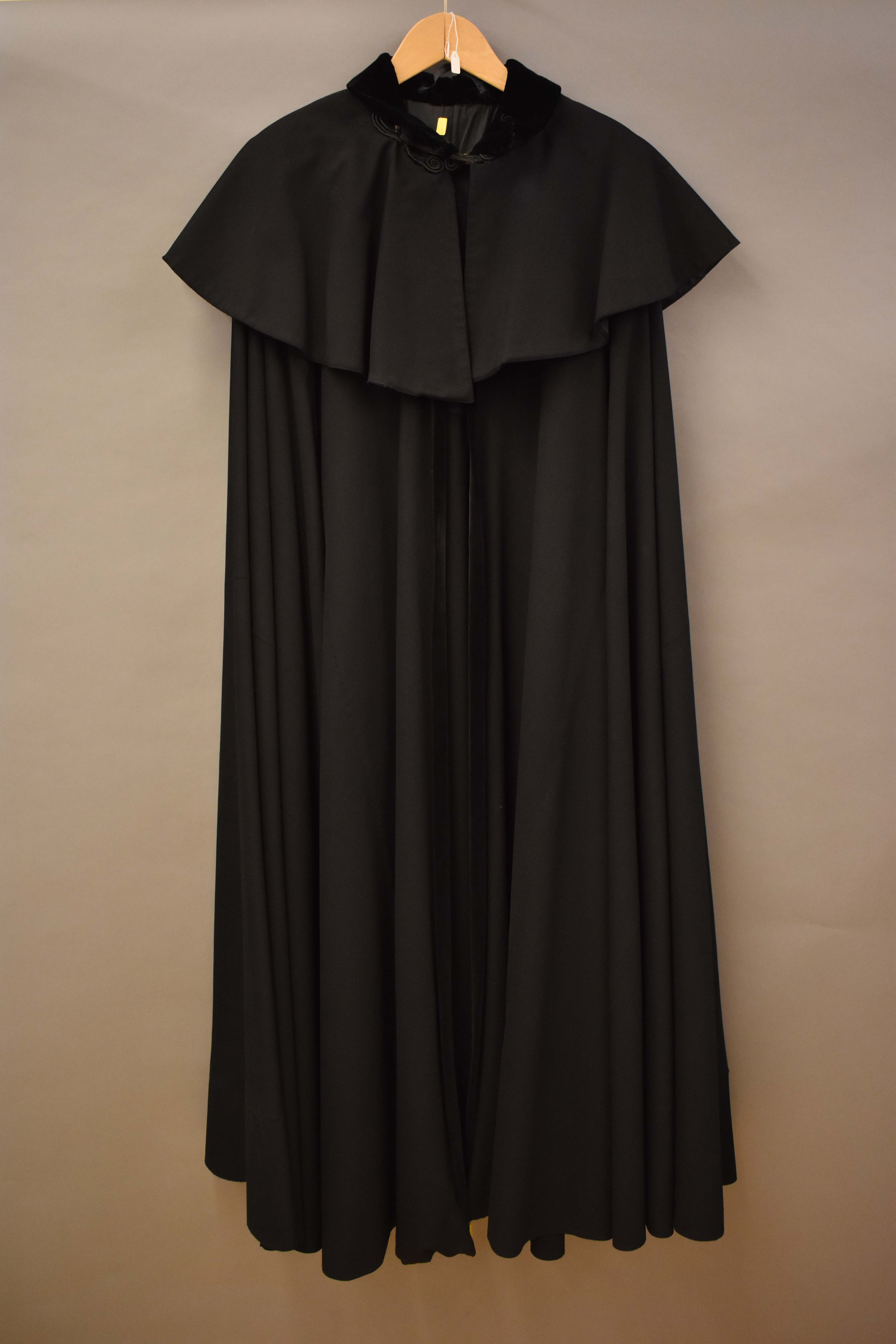 Zwarte wintermantel (alma viva) met pelerine en kraag, langs voorzijde fluwelen baan