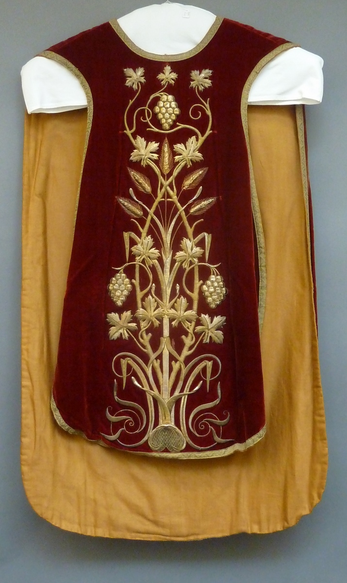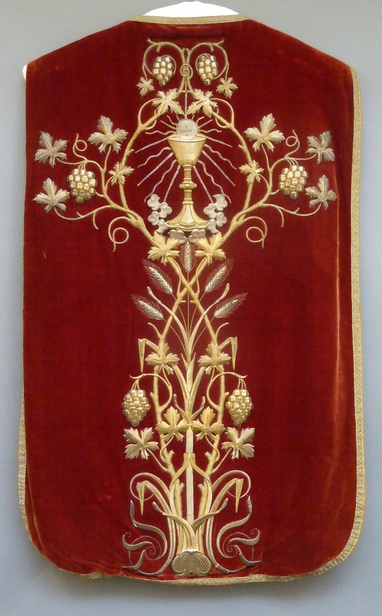 Rood kazuifel met hoog opgewerkt borduurwerk van druiventrossen, korenaren, kelk met hostie