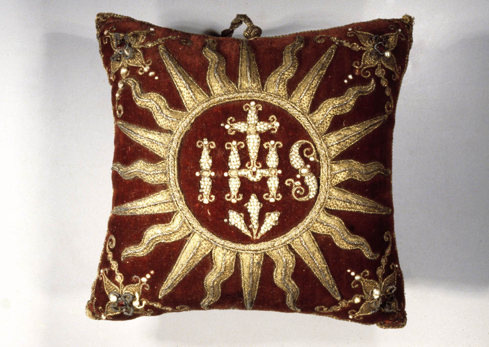 Op het rood fluwelen speldekussen zijn aan de bovenkant in een medaillon het Christusmonogram IHS en drie kruisnagels geborduurd. Op de symbolen zijn pareltjes vastgezet. Om het medaillon is met gelegd en gehecht gouddraad een stralenkrans aangebracht. In de hoeken van het kussen kruisvormige bloemversieringen van gelegd gouddraad, waarin centraal een halfedelsteentje is gevat en ...