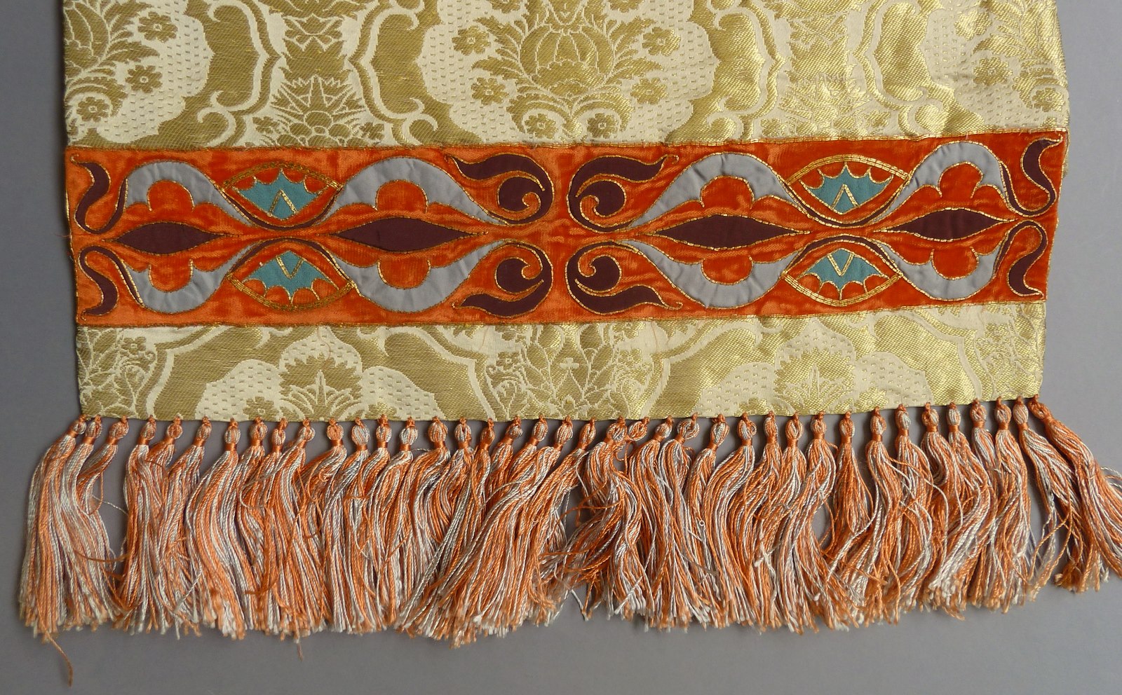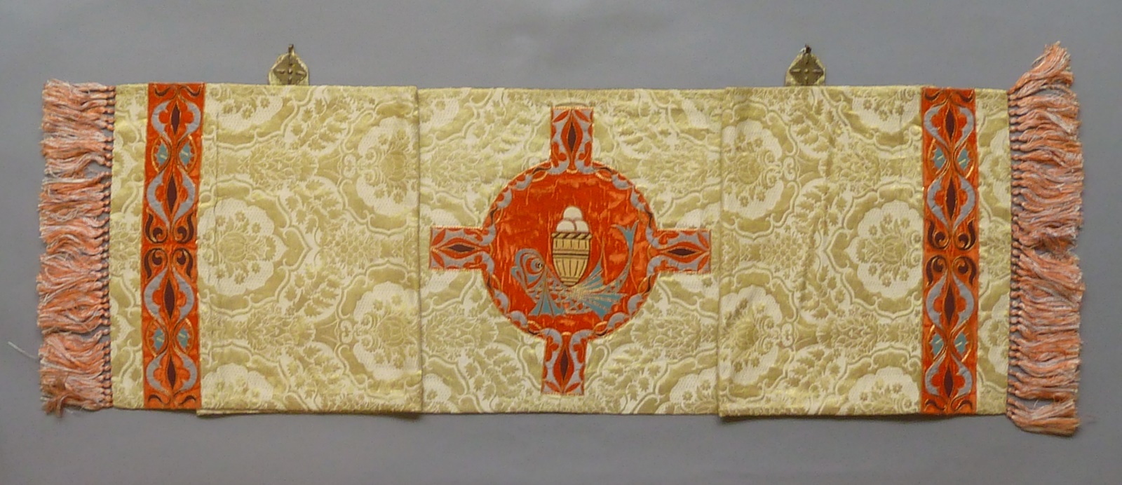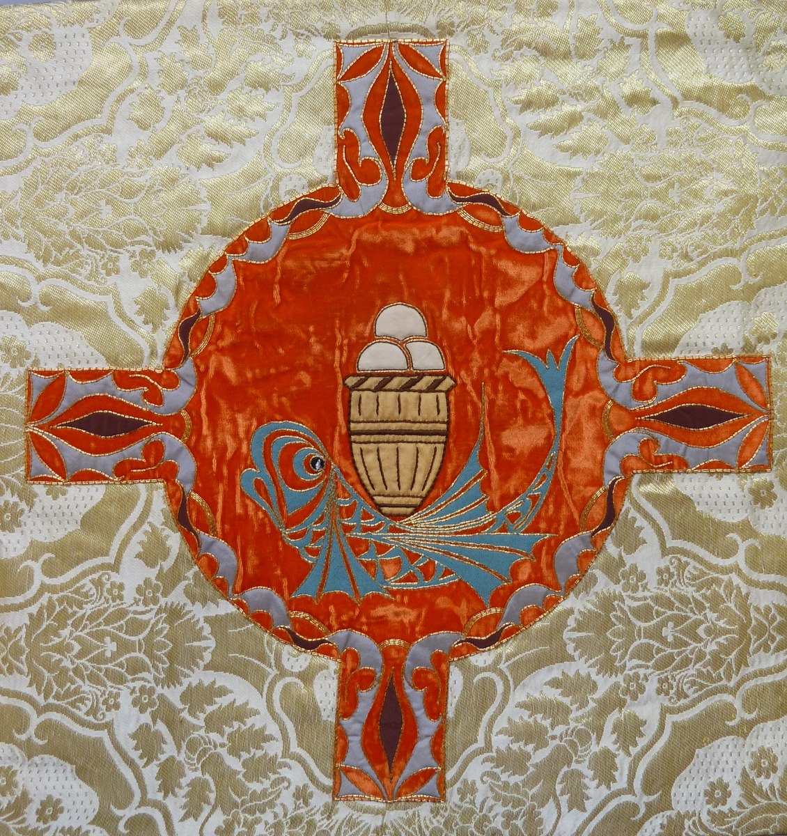 Wit schoudevelum met ingeweven goudkleurige granaatappels, oranje applicaties met vis en broden