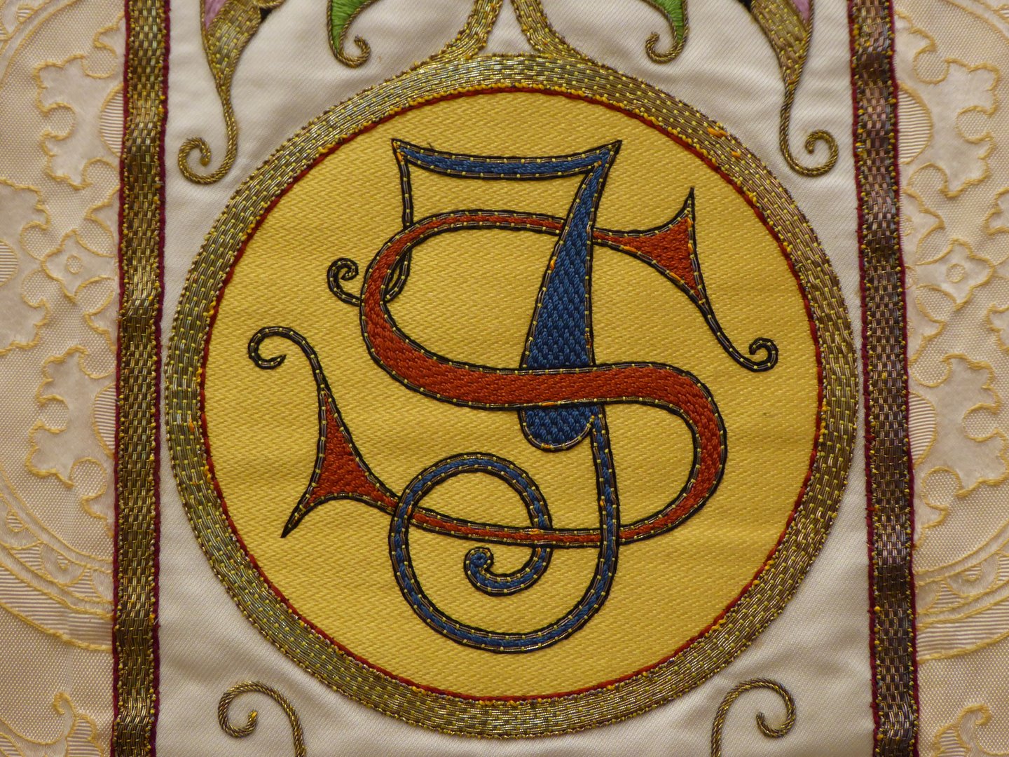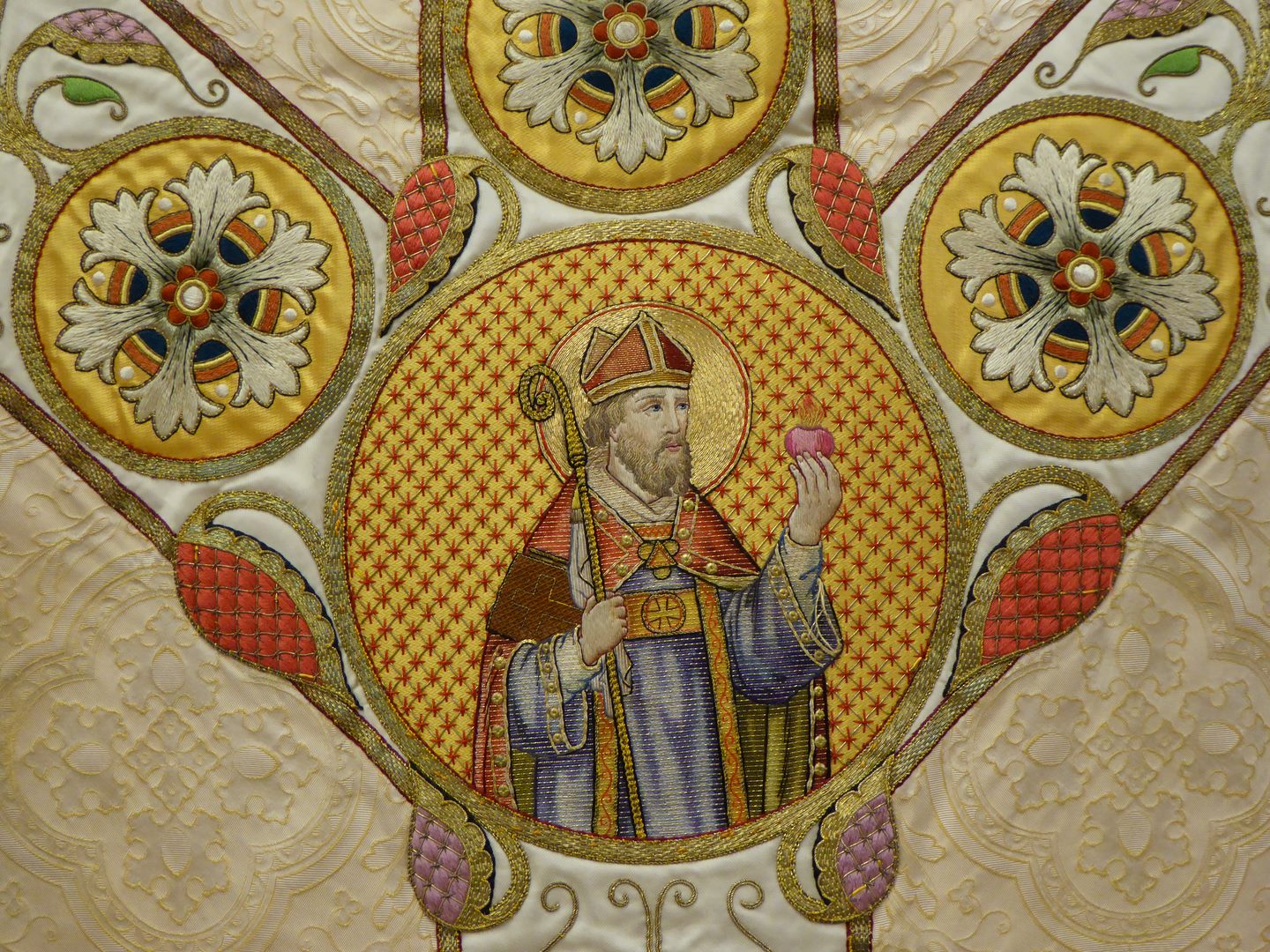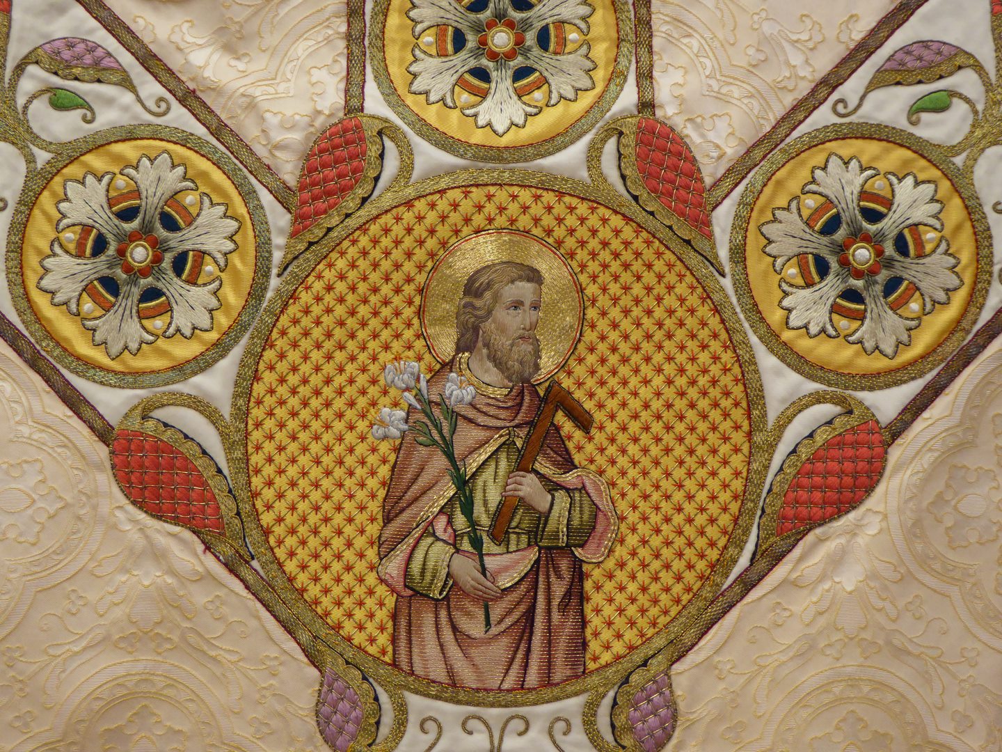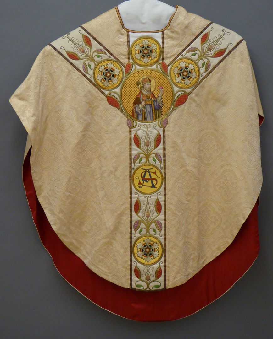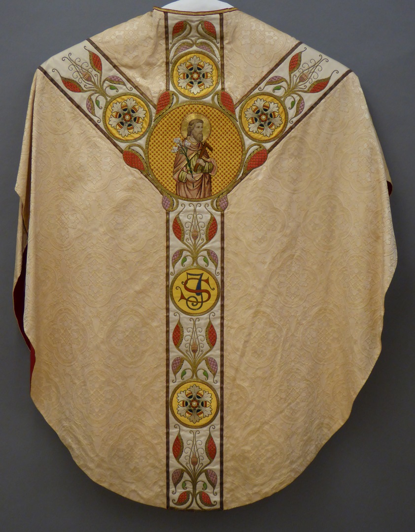 Wit (crème) kazuifel in gotisch model met ingeweven gele vierpassen, met Augustinus en Jozef
