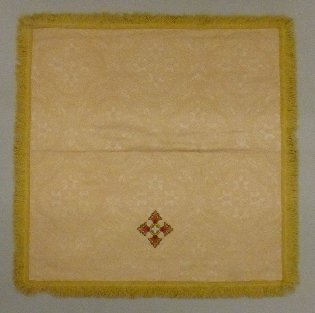 Wit (crème) kelkvelum met patroon van ingeweven vierpassen, met geborduurd kruisje en gele franje